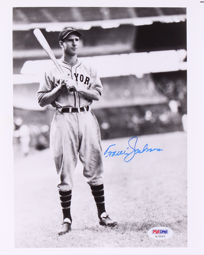 Photo measures 8" x 10" in size and has been hand-signed in blue felt-tip pen by Travis Jackson (D 1987, Giants HOF).