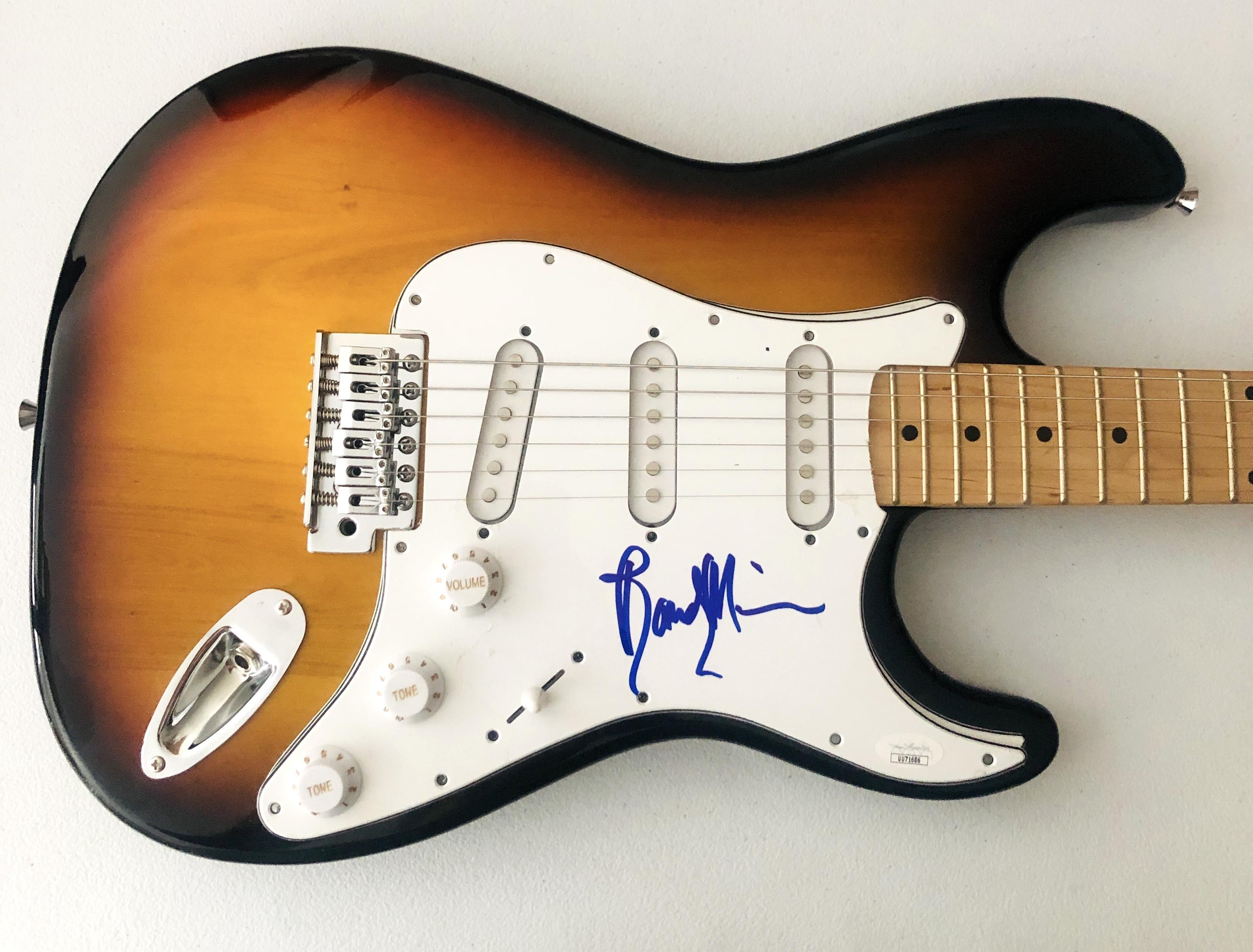 Sunburst-finish stratocaster-style electric guitar has been hand-signed on the pickguard by Randy Meisner.
