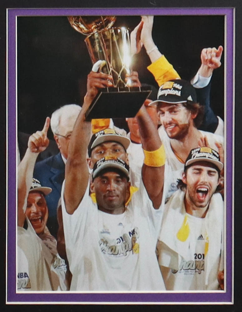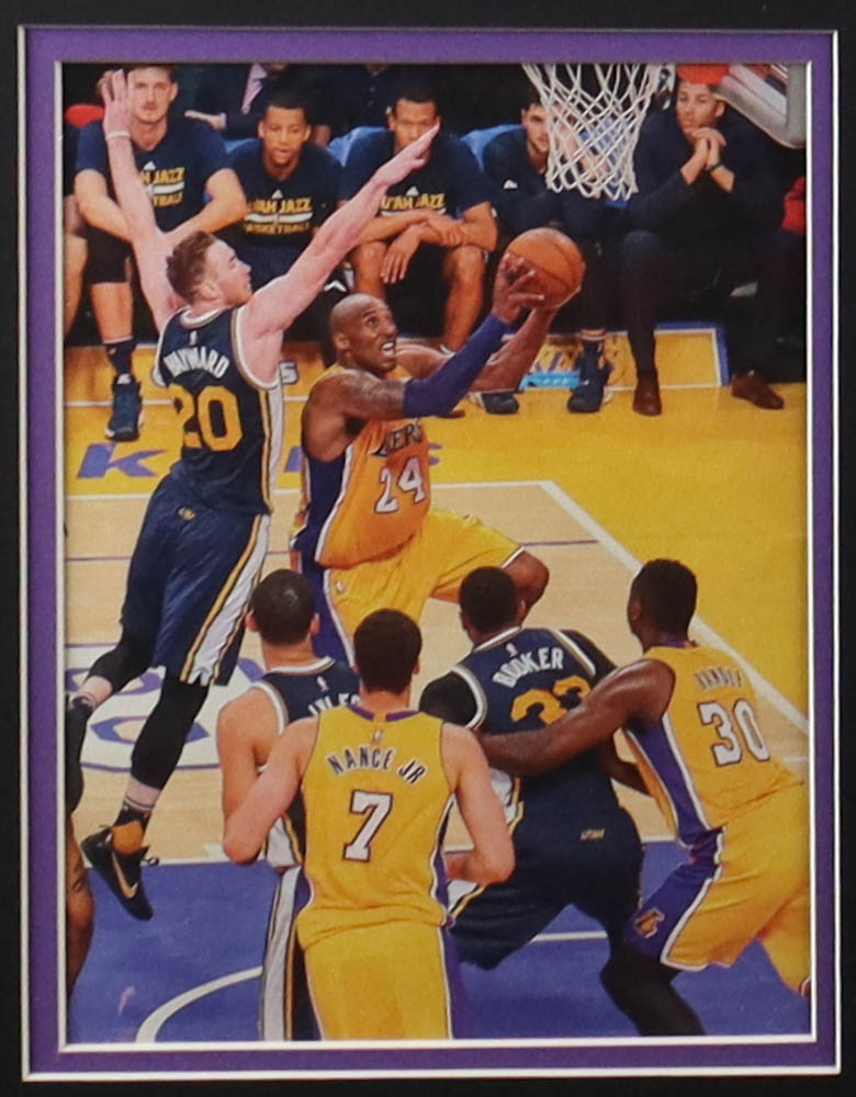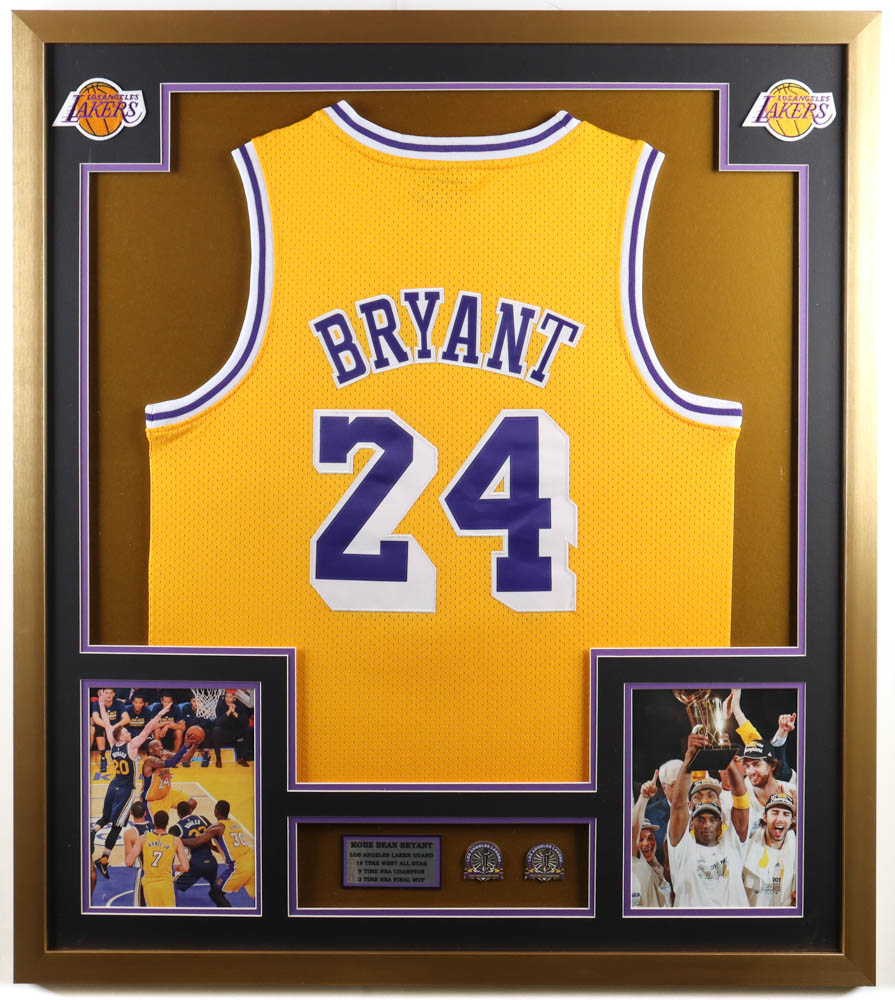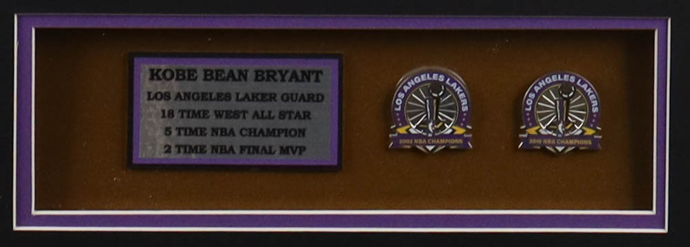 Custom frame measures 32" x 36" in size and features an unsigned on-court style Kobe Bryant (D. 2020, HOF) jersey. The display also includes (2) Lakers Championship pins, (2) team logo patches as well as (2) photos. Please note, the display is unsigned.