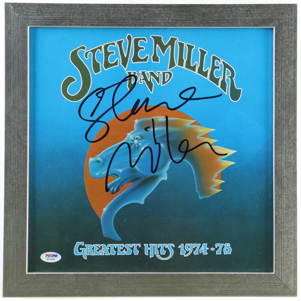Custom frame measures approximately 14" x 15" in size. Features a "Steve Miller Band Greatest Hits 1974-78" album cover that has been hand-signed by Steve Miller. The vinyl record is included as shown.