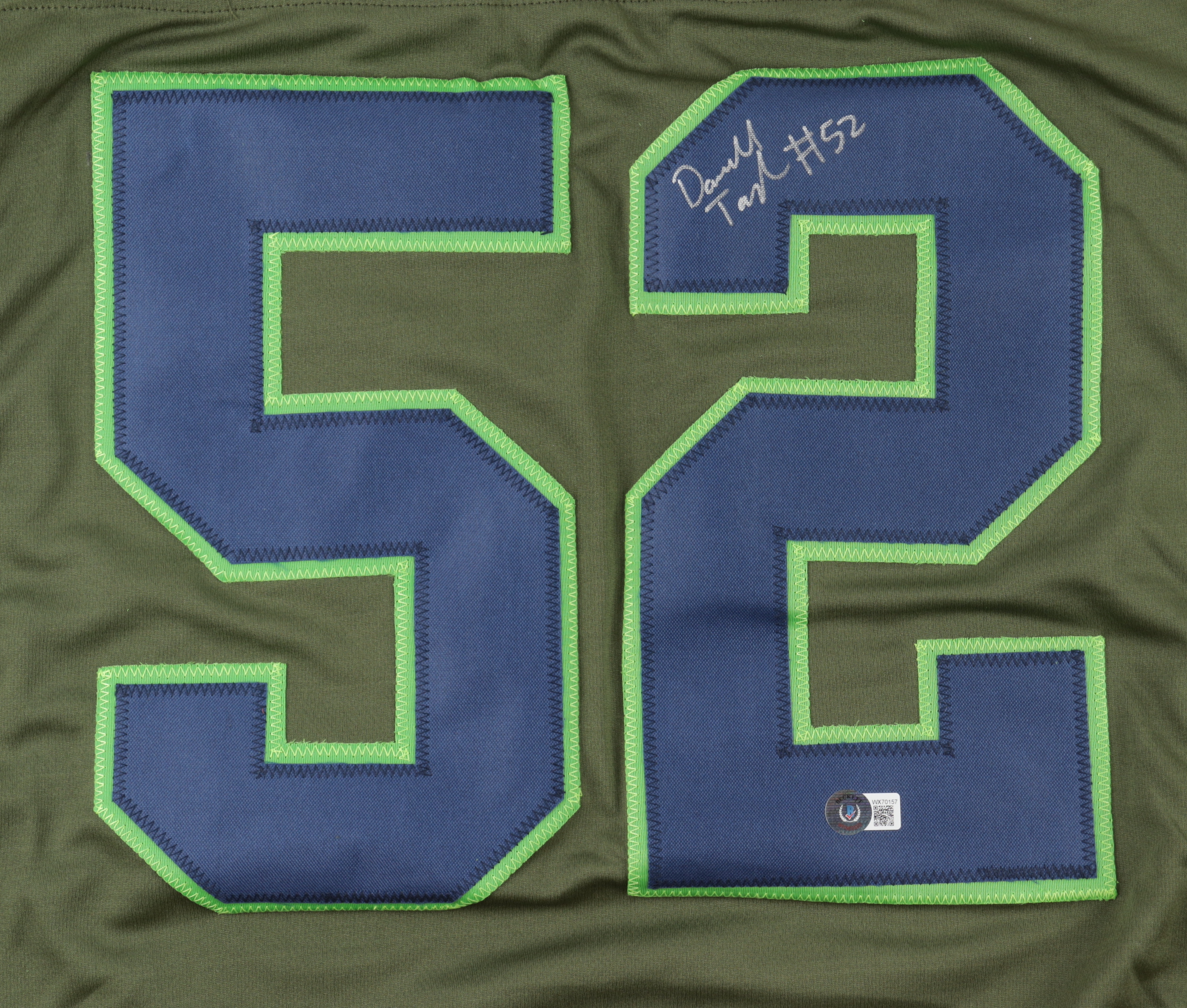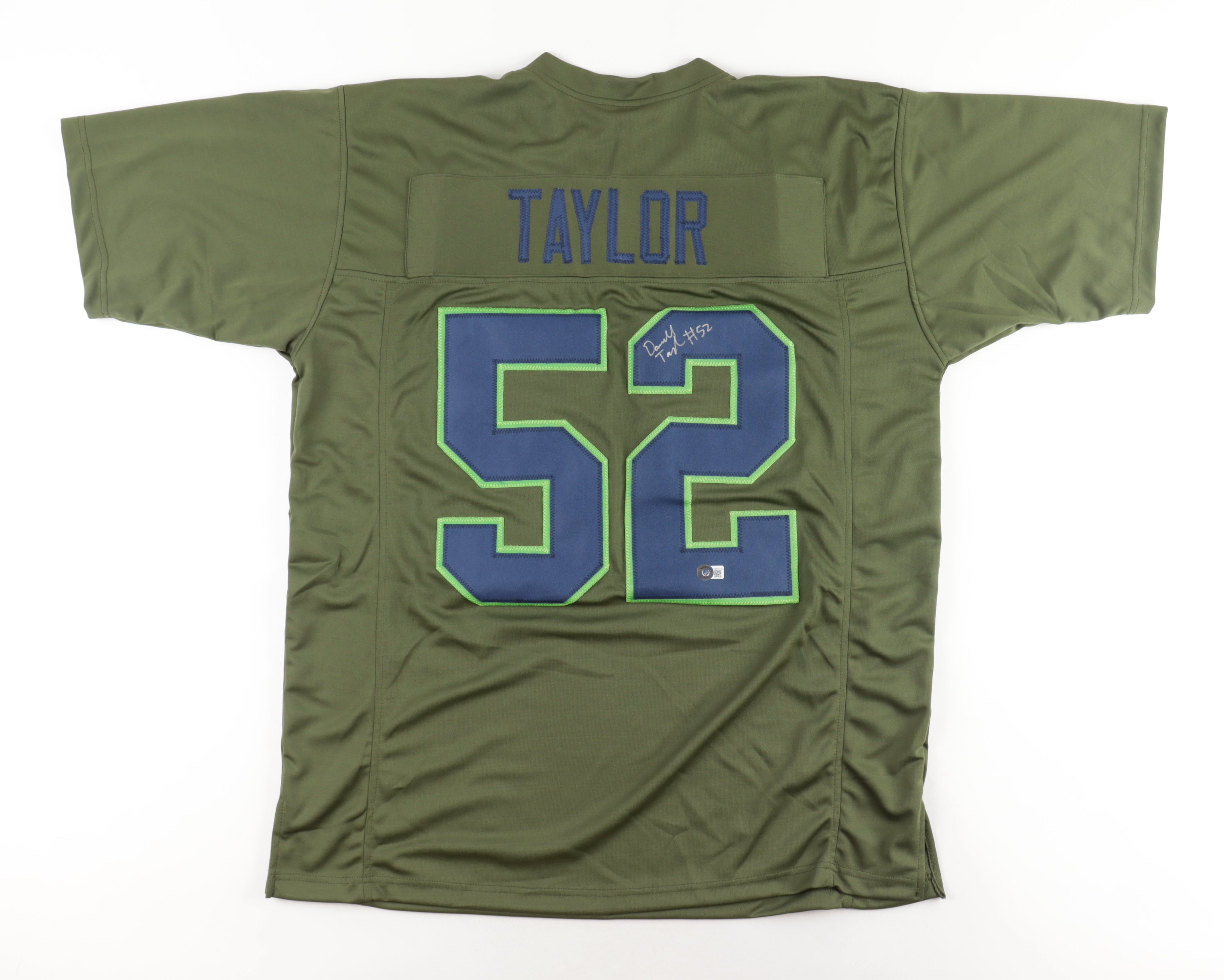 Custom on-field style jersey. Everything sewn on, size XL. Hand-signed by Darrell Taylor.