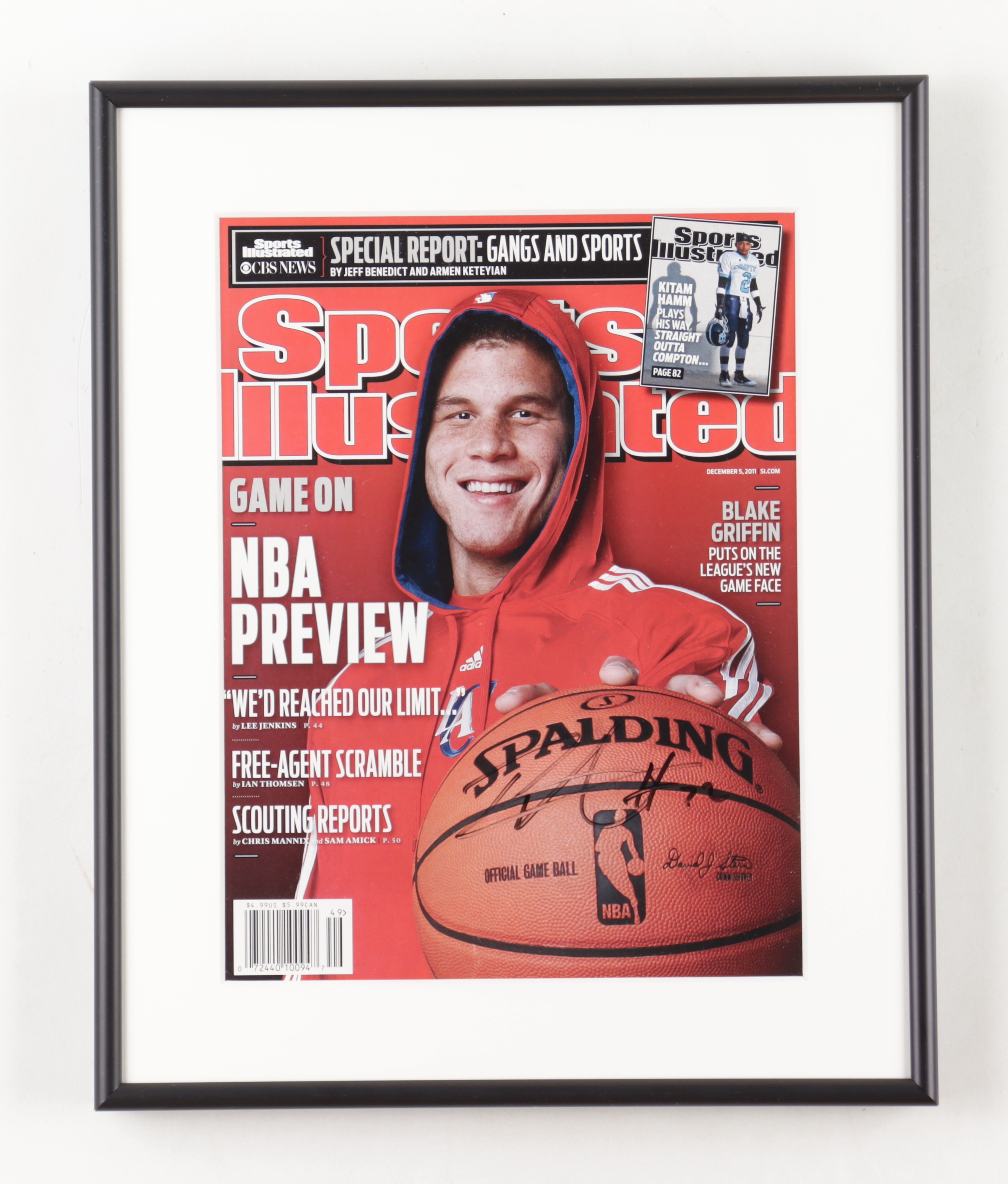 Custom frame measures 11" x 14" in size. Features a magazine dated December 5, 2011 that has been had-signed by Blake Griffin (Los Angeles Clippers).
