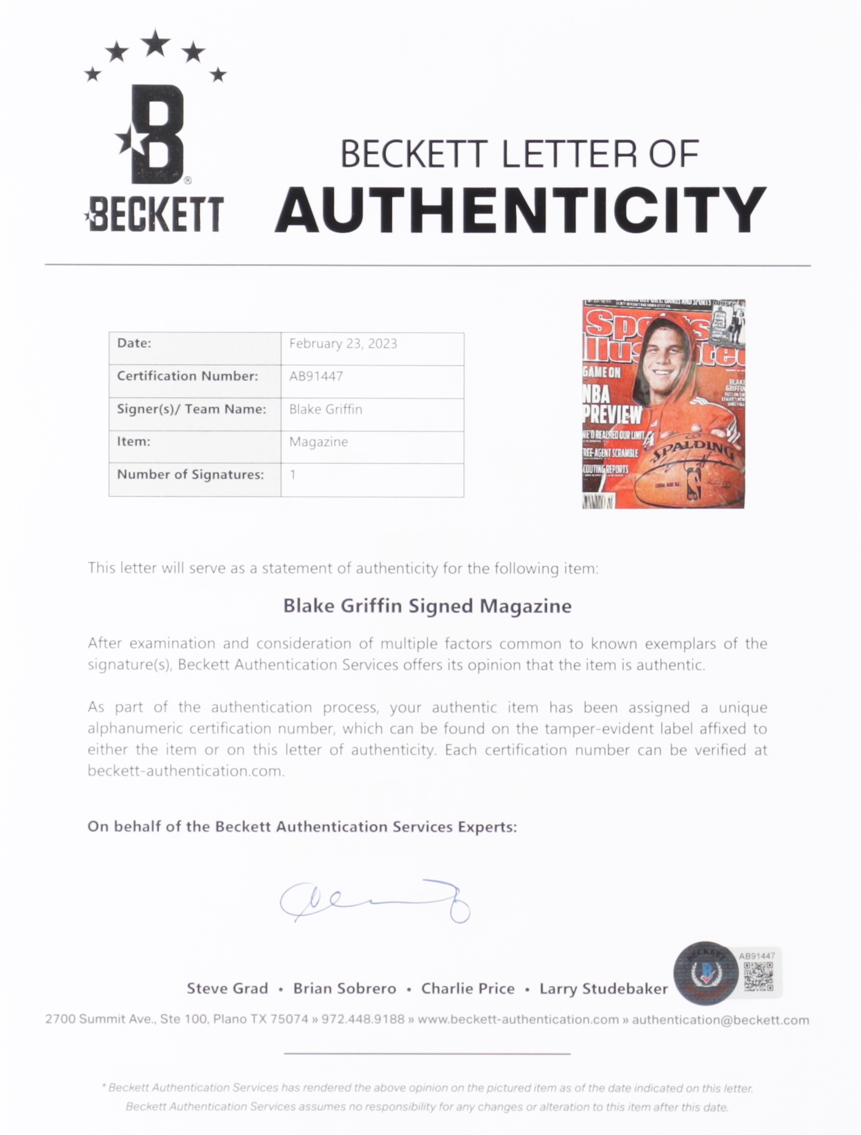 The autograph includes an official Beckett Authentication Services hologram and matching LOA for authenticity purposes.