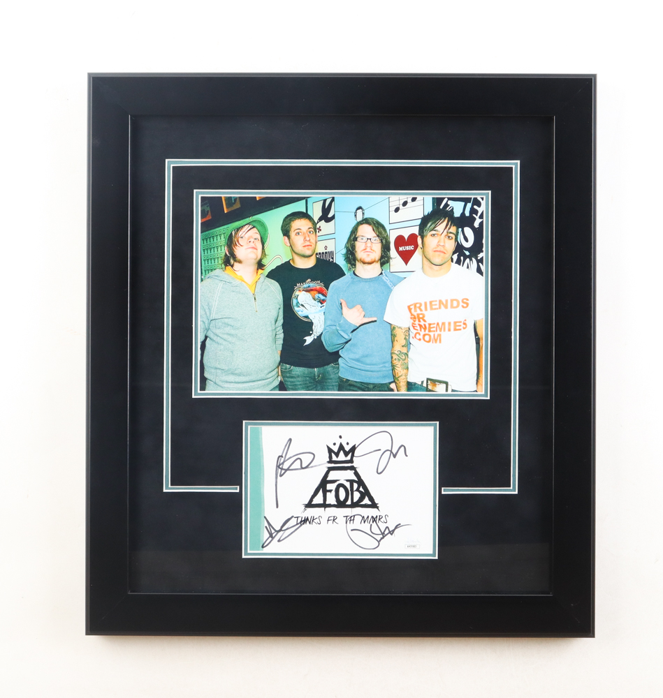 Framed display measures 19" x 21" in size features a cut that has been hand-signed by all (4) members of Fall Out Boy. Signers include Pete Wentz, Patrick Stump, Andy Hurley and Joe Trohman. The display also includes a photo of Fall Out Boy.