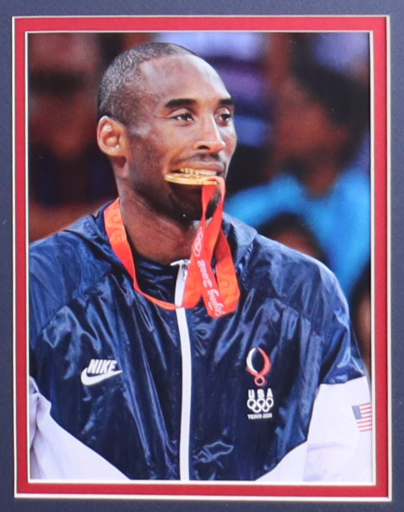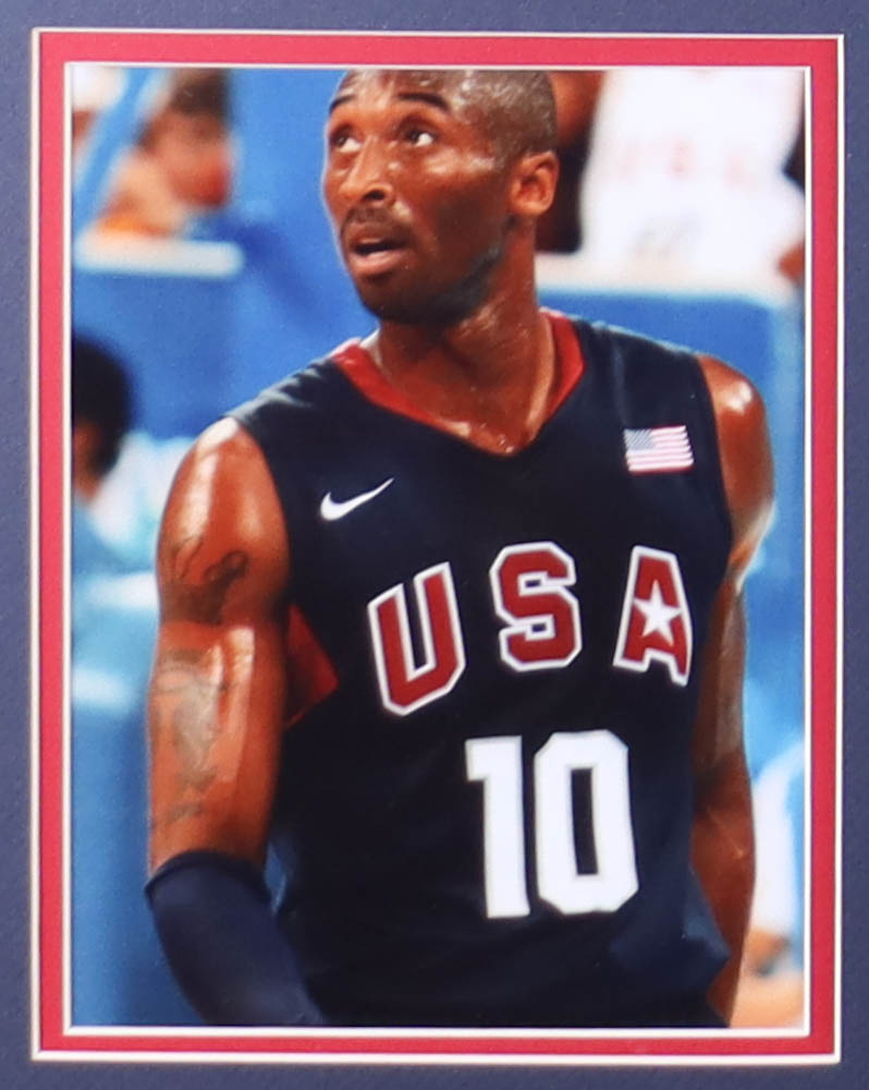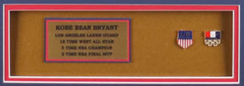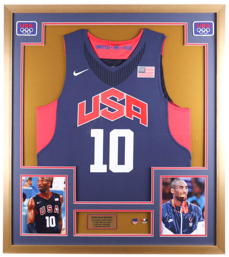 Custom framed display measures approximately 32" x 36" in size and features a Nike on-court style jersey of Kobe Bryant (D. 2020, Los Angeles Lakers, HOF). Display also features (2) vintage Team USA Olympic pins and (2) photos. Please note, the display is unsigned.