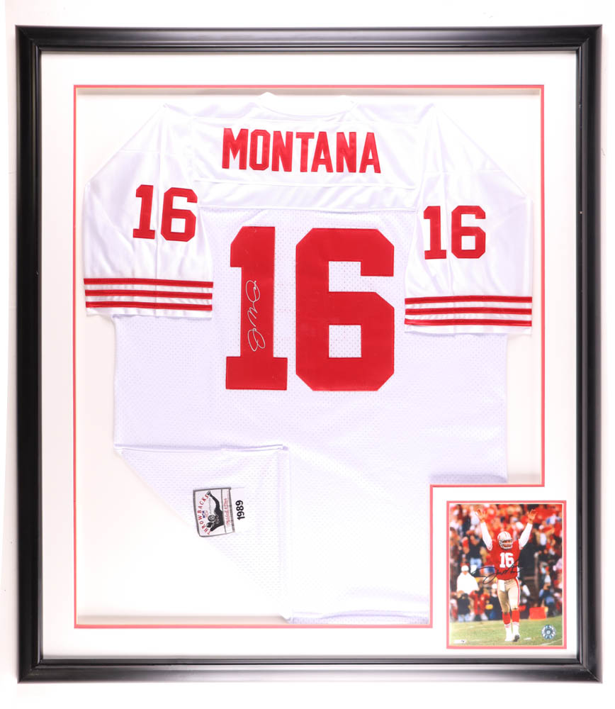 Custom frame measures 41" x 46" in size and features a Mitchell and Ness throwback jersey hand-signed by Joe Montana (HOF). Please note, the autograph on the photo is facsimile.