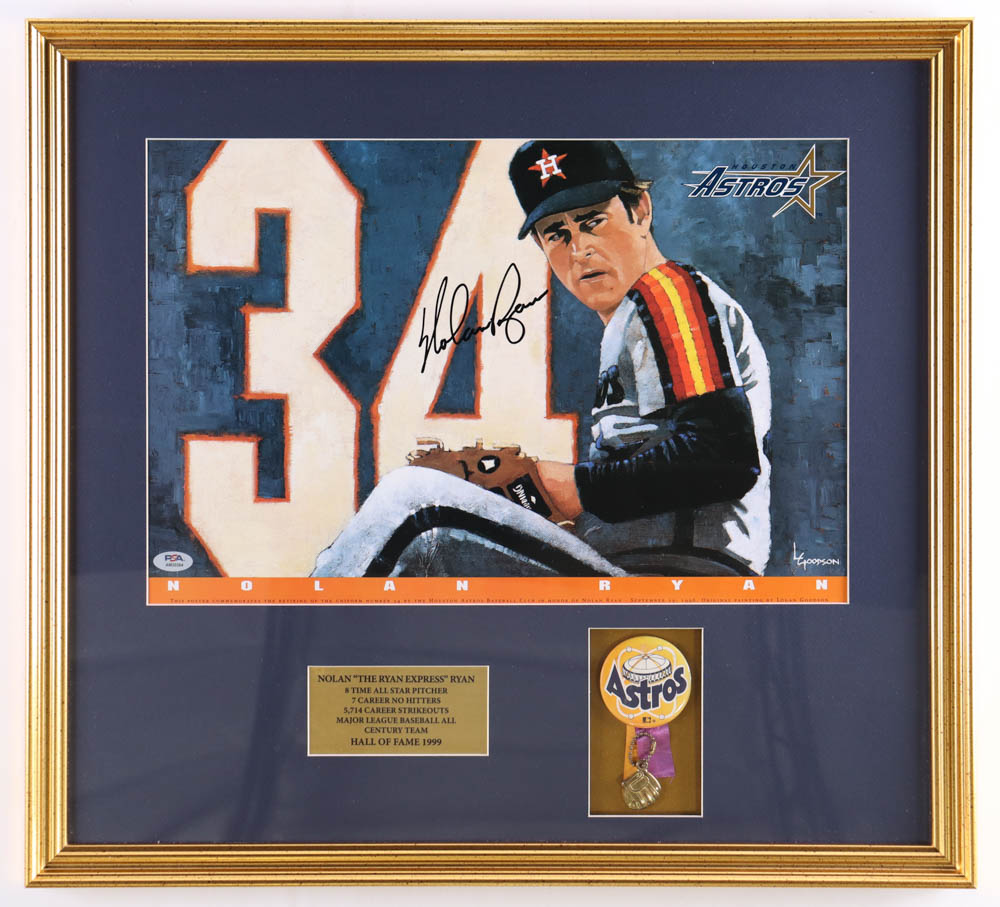 Nolan Ryan Signed Astros Custom Framed 1996 Astros Art Print With Vintage 1970s Astros Pin Display (PSA)