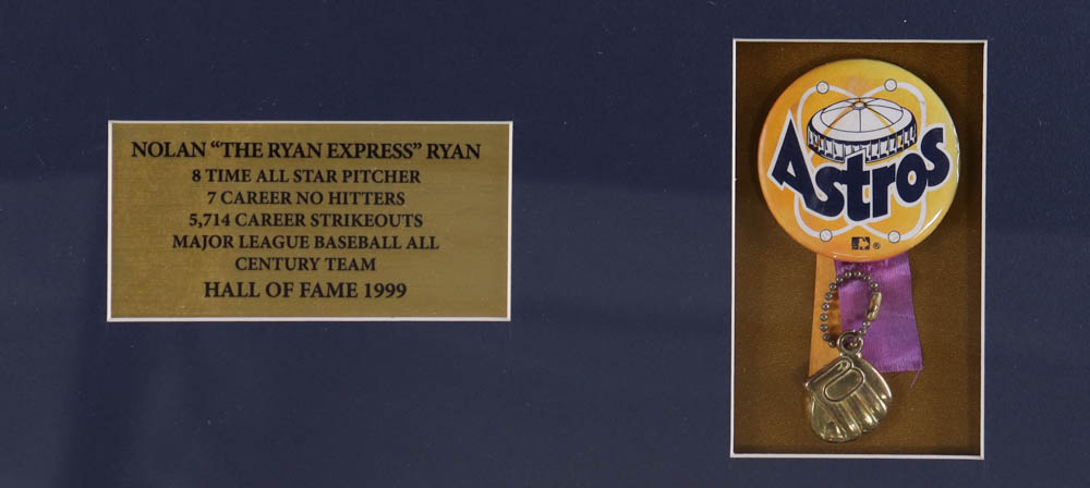 The custom framed photo display measures 22" x 24" in size and features a photo that has been hand-signed by Nolan Ryan and a vintage Astros pin (Houston Astros, HOF).