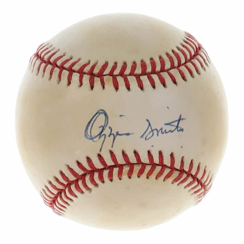 Rawlings Official National League baseball. Hand-signed by Ozzie Smith (St. Louis Cardinals, HOF). Please note, the baseball is naturally toned.