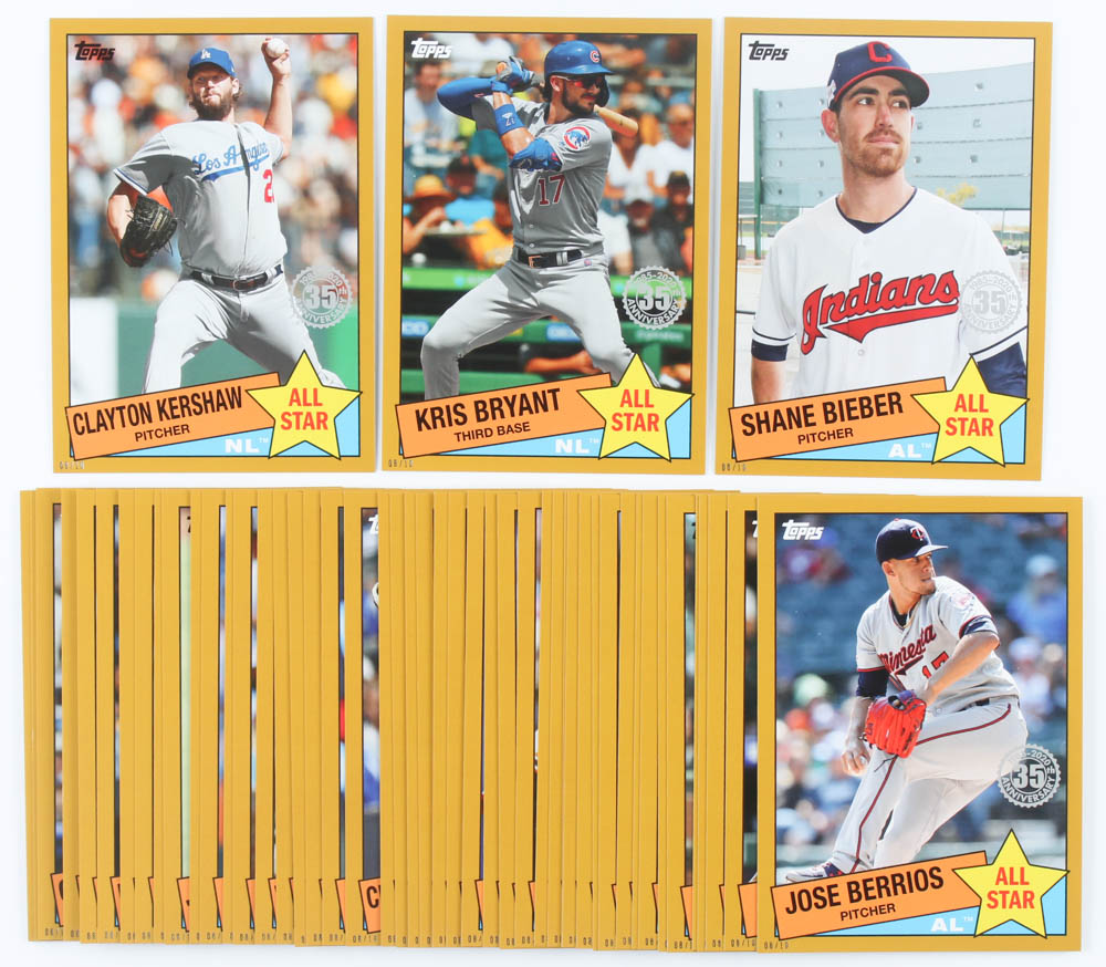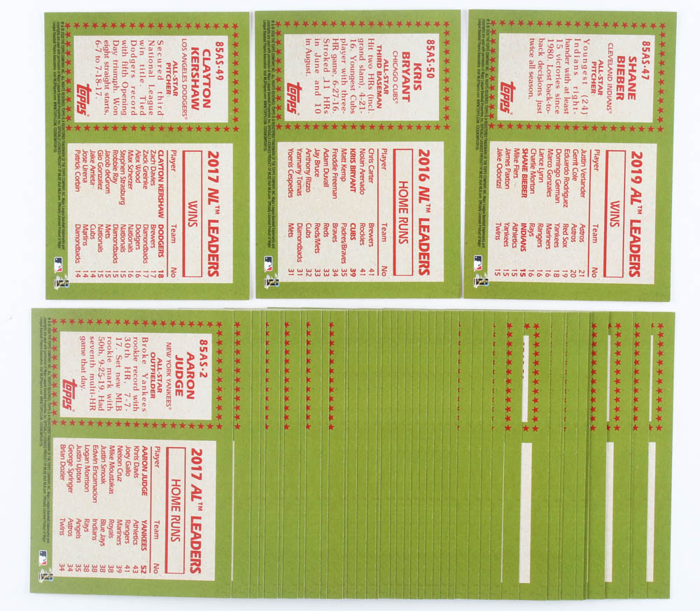 Set of (50) 2020 Topps '85 Topps All Stars Oversized Baseball Cards with #85AS-49 Clayton Kershaw, #85AS-50 Kris Bryant, #85AS-47 Shane Bieber
