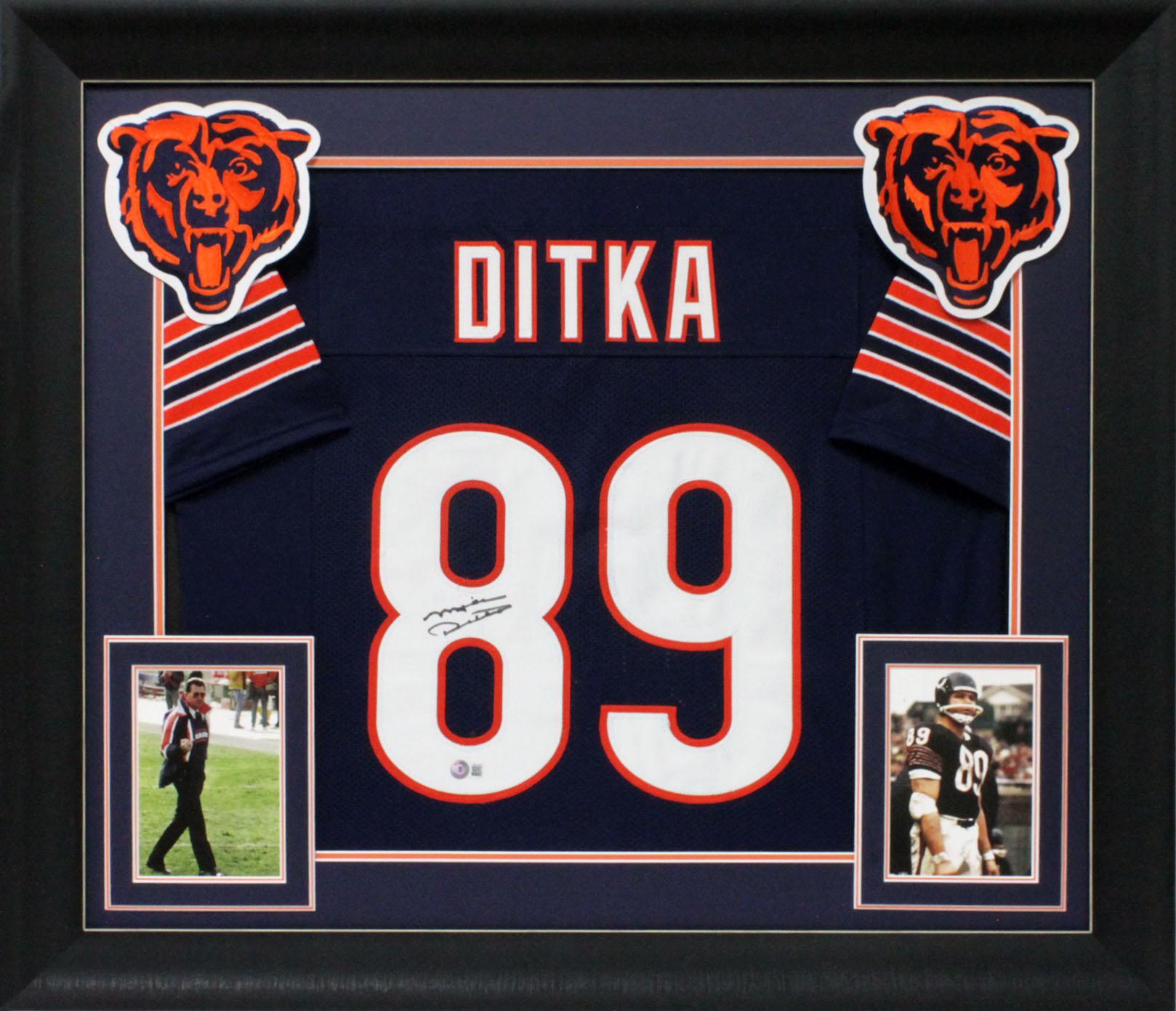 Custom frame measures approximately 32" x 37" in size and features a jersey hand-signed by Mike Ditka (HOF). The display also includes (2) photographs of Mike Ditka.