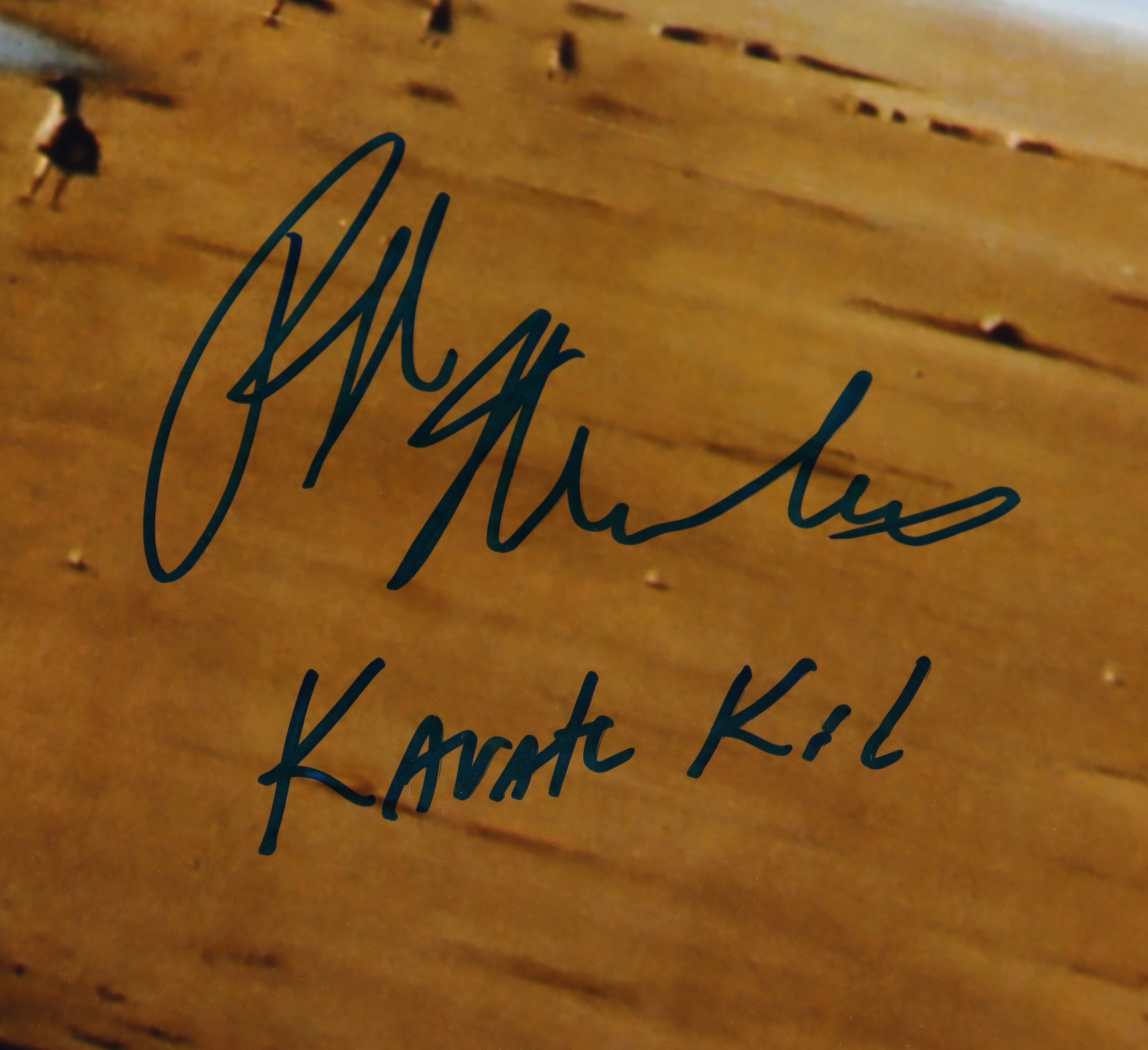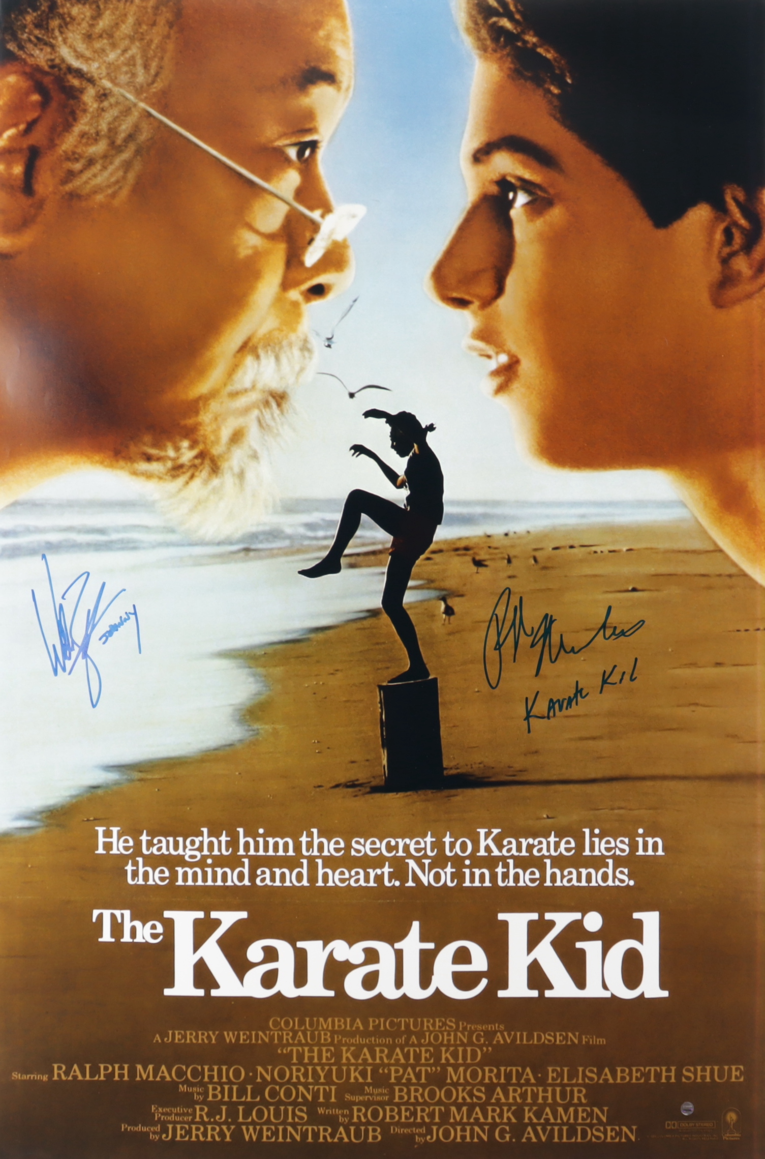 Poster measures approximately 24" x 36" in size and has been hand-signed and inscribed by Ralph Macchio (Daniel LaRusso) and William Zabka (Johnny Lawrence). Please see photos for condition of poster.