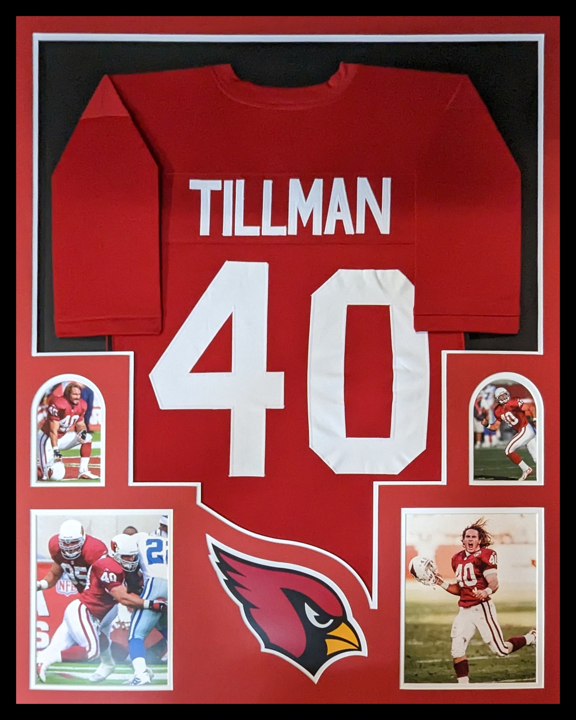Custom framed display measures approximately 34" x 42" in size and features a custom jersey of Pat Tillman. Please note, the display is unsigned.