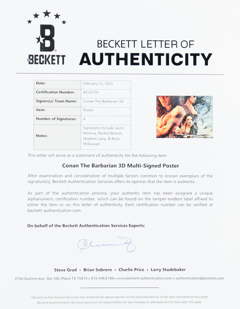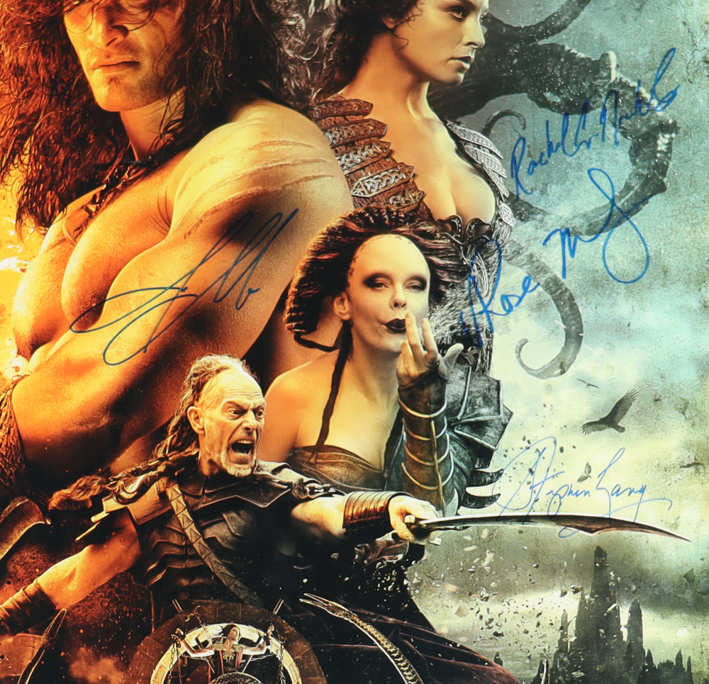 Poster measures 27" x 40" in size and has been hand-signed by Jason Momoa (Conan), Rachel Nichols (Tamara), Stephen Lang (Khalar Zym), and Rose McGowan (Marique).