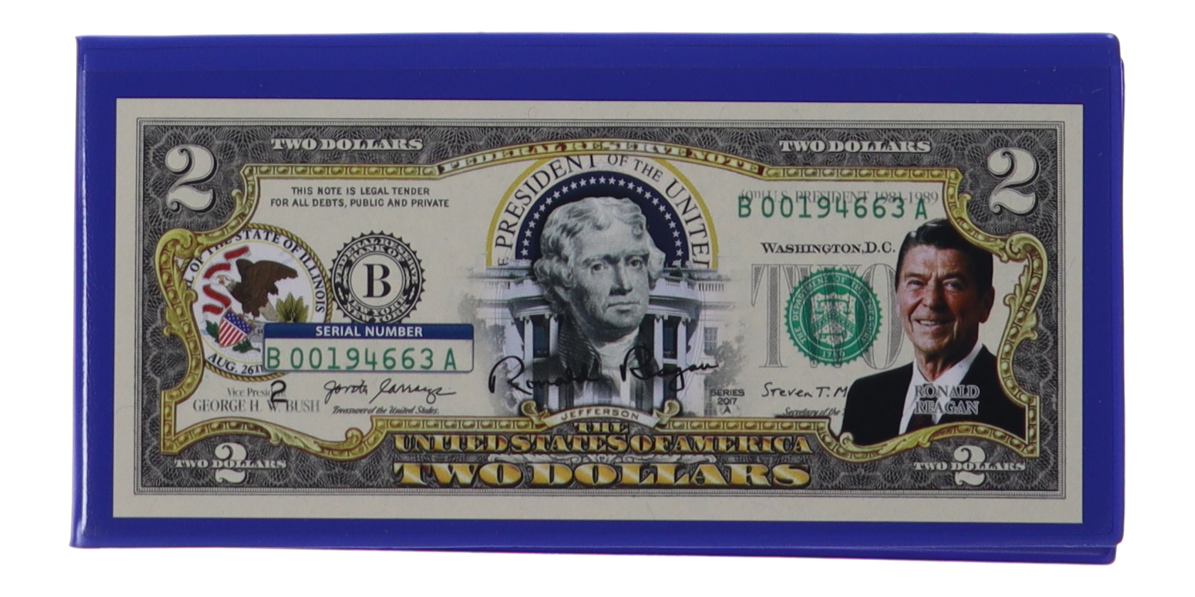 Ronald Reagan Genuine Legal Tender Colorized U.S. $2.00 Two Dollar Bill Commemorative Edition Bank Note with Folder