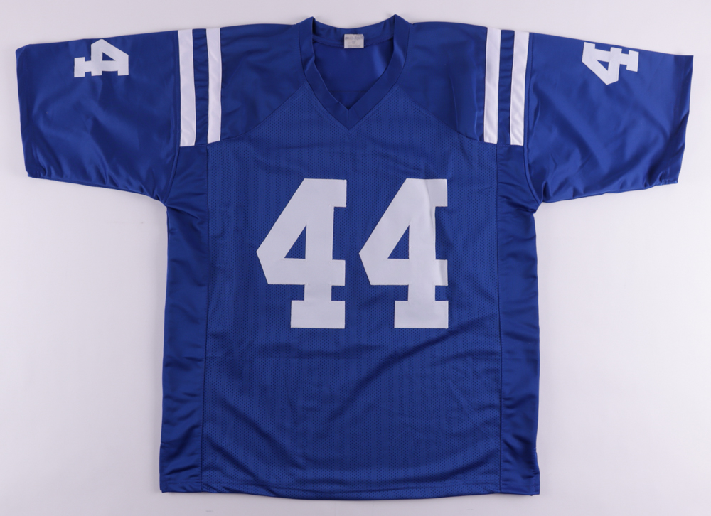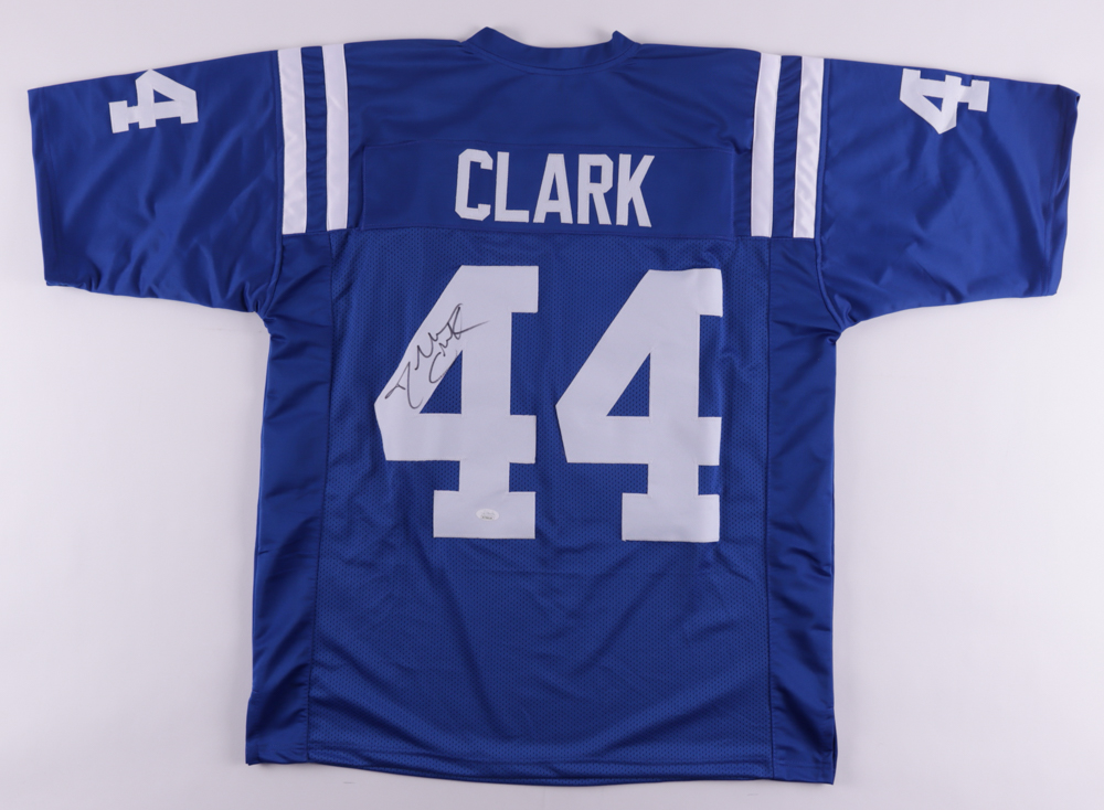 Custom on-field style jersey. Everything is sewn on, size XL. Has been hand-signed by Dallas Clark.
