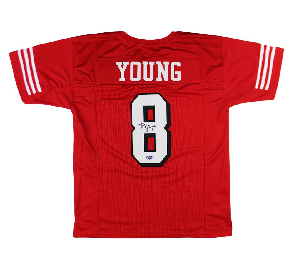 Custom on-field style jersey. Everything is sewn on, size XL. Hand-signed by Steve Young (HOF).