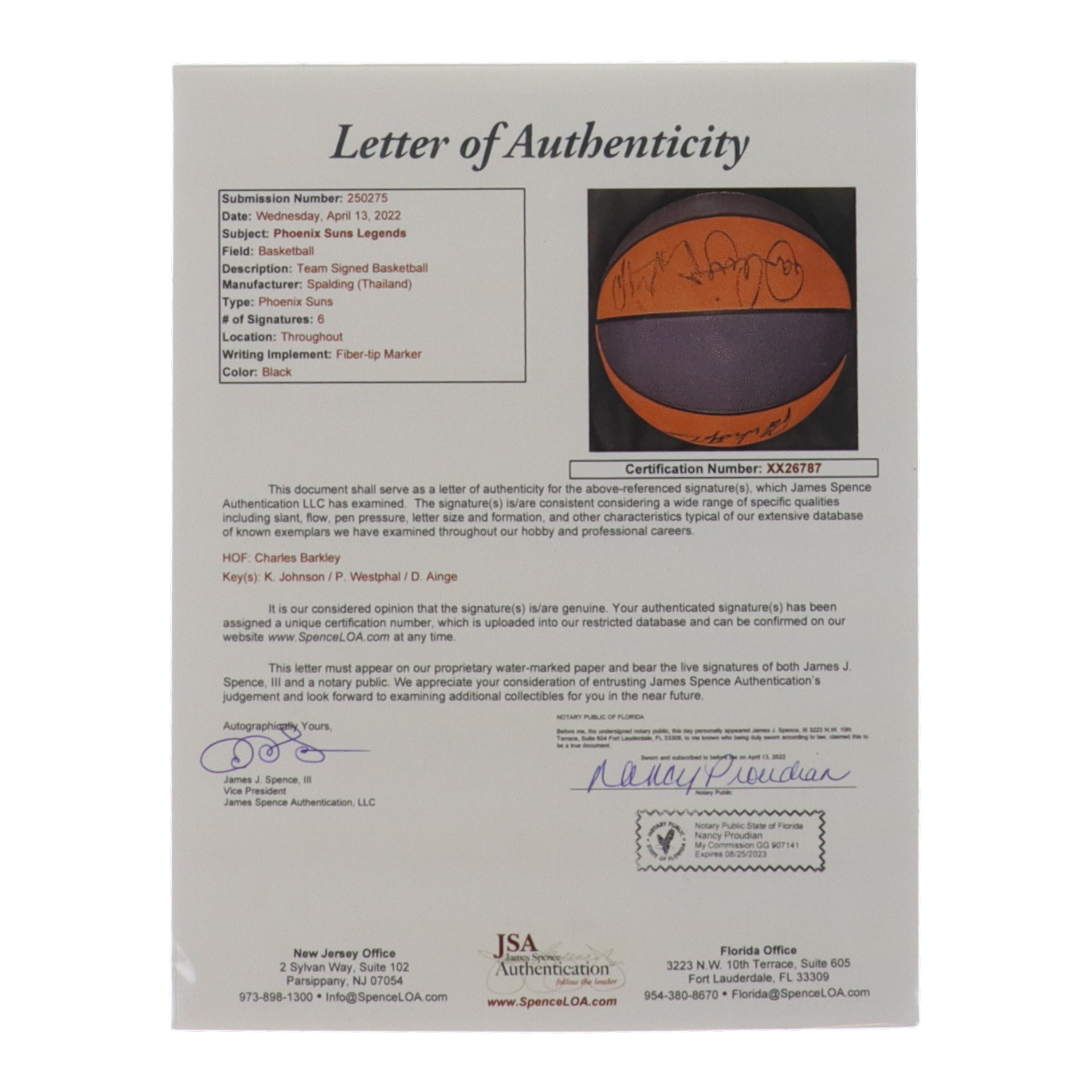 Phoenix Suns Legends Basketball Signed by (6) with Charles Barkley, Kevin Johnson, Paul Westphal, Danny Ainge (JSA)