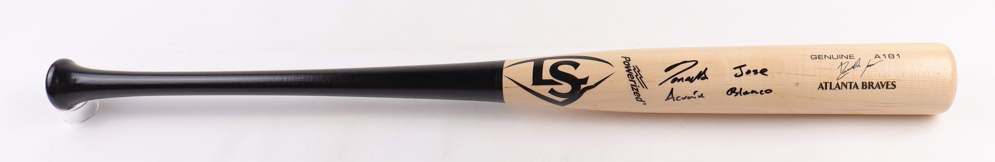 Louisville Slugger Powerized baseball bat has been hand-signed and inscribed by Ronald Acuna Jr. (Atlanta Braves).
