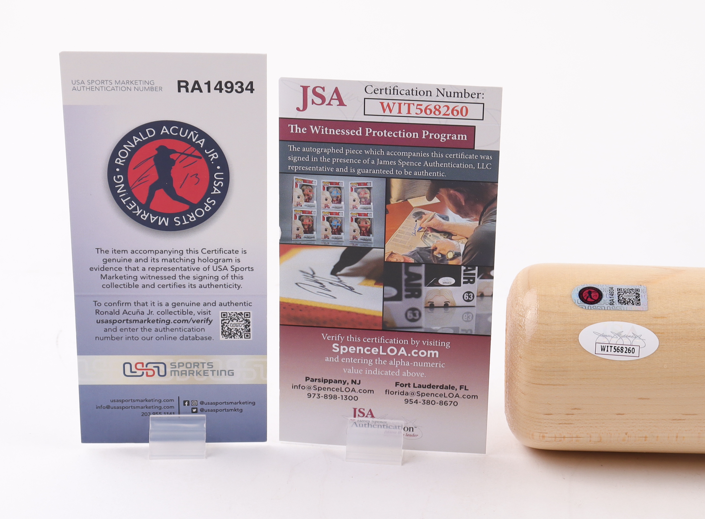 The lot / autograph(s) includes an official James Spence Authentication (JSA) hologram and matching COA for authenticity purposes. The signing of this item was witnessed by JSA also includes an official USA Sports Marketing Ronald Acuna Jr. hologram for authenticity purposes.