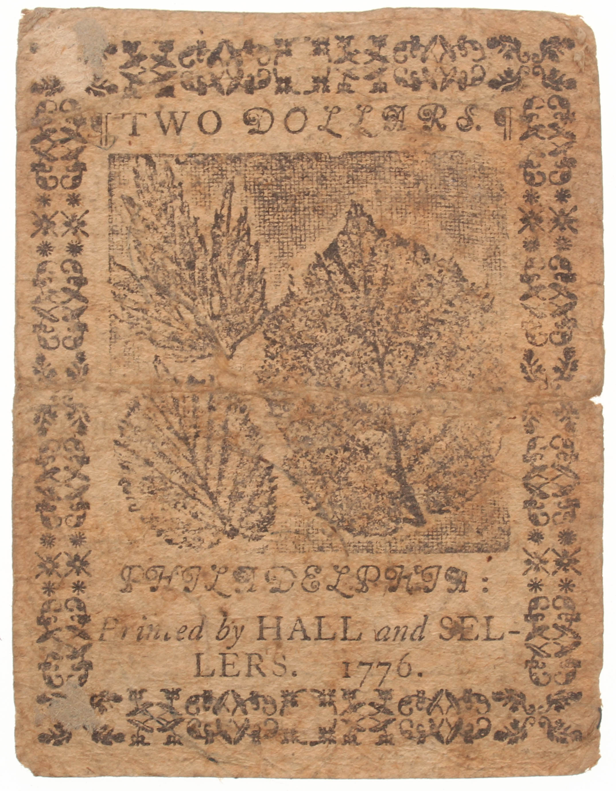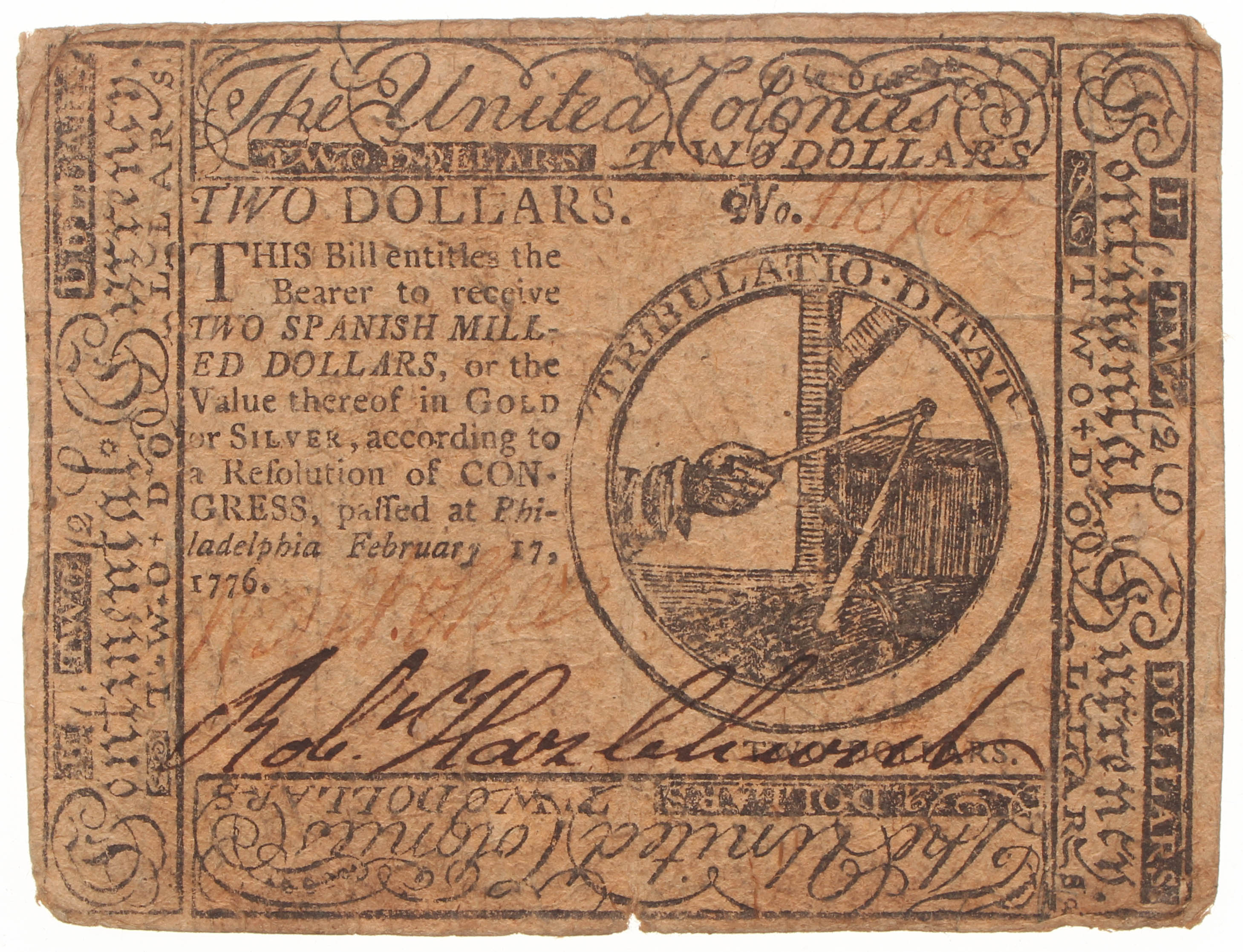 1776 $2 Two Dollars Continental Colonial Currency Note