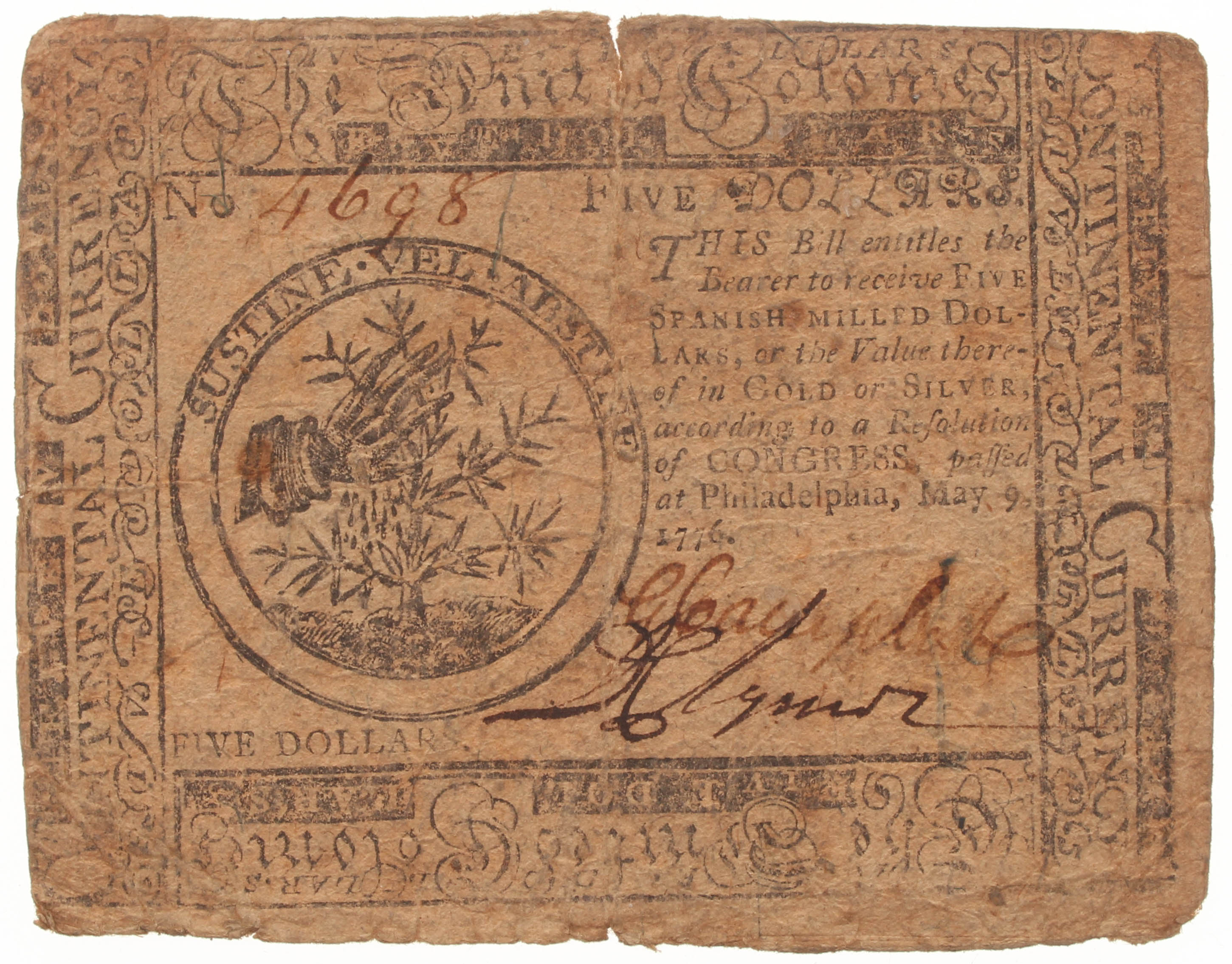 1776 $5 Five Dollars Continental Colonial Currency Note