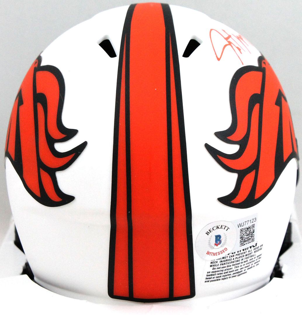 Riddell Denver Broncos lunar eclipse alternate speed mini helmet. Has been hand-signed by Javonte Williams.