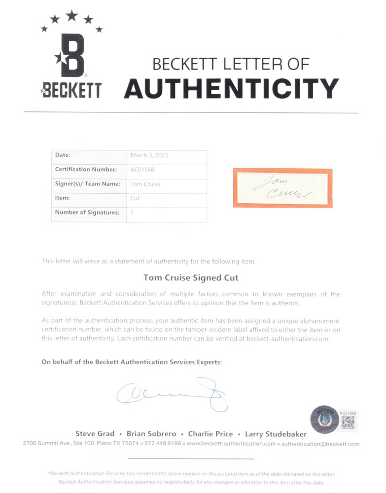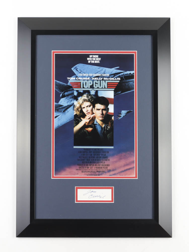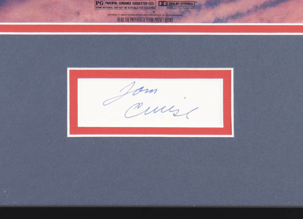 Custom frame measures 16.5" x 23.5" in size and features a cut that has been hand-signed by Tom Cruise. The display also includes a poster print from the film.