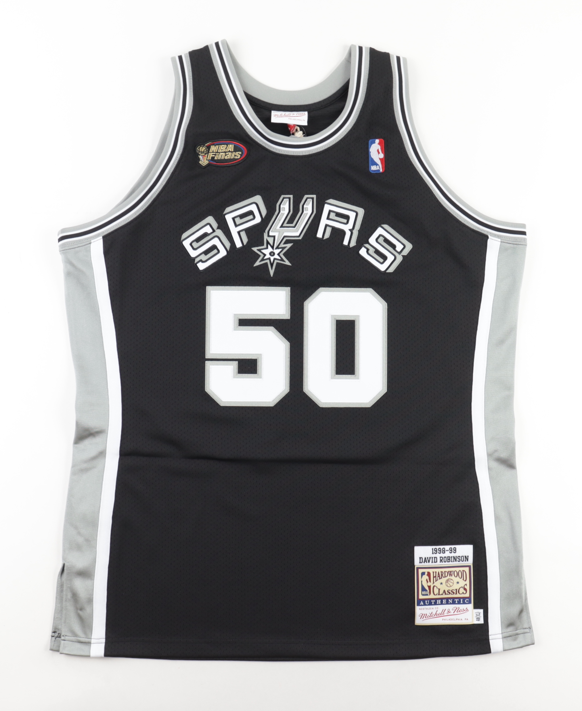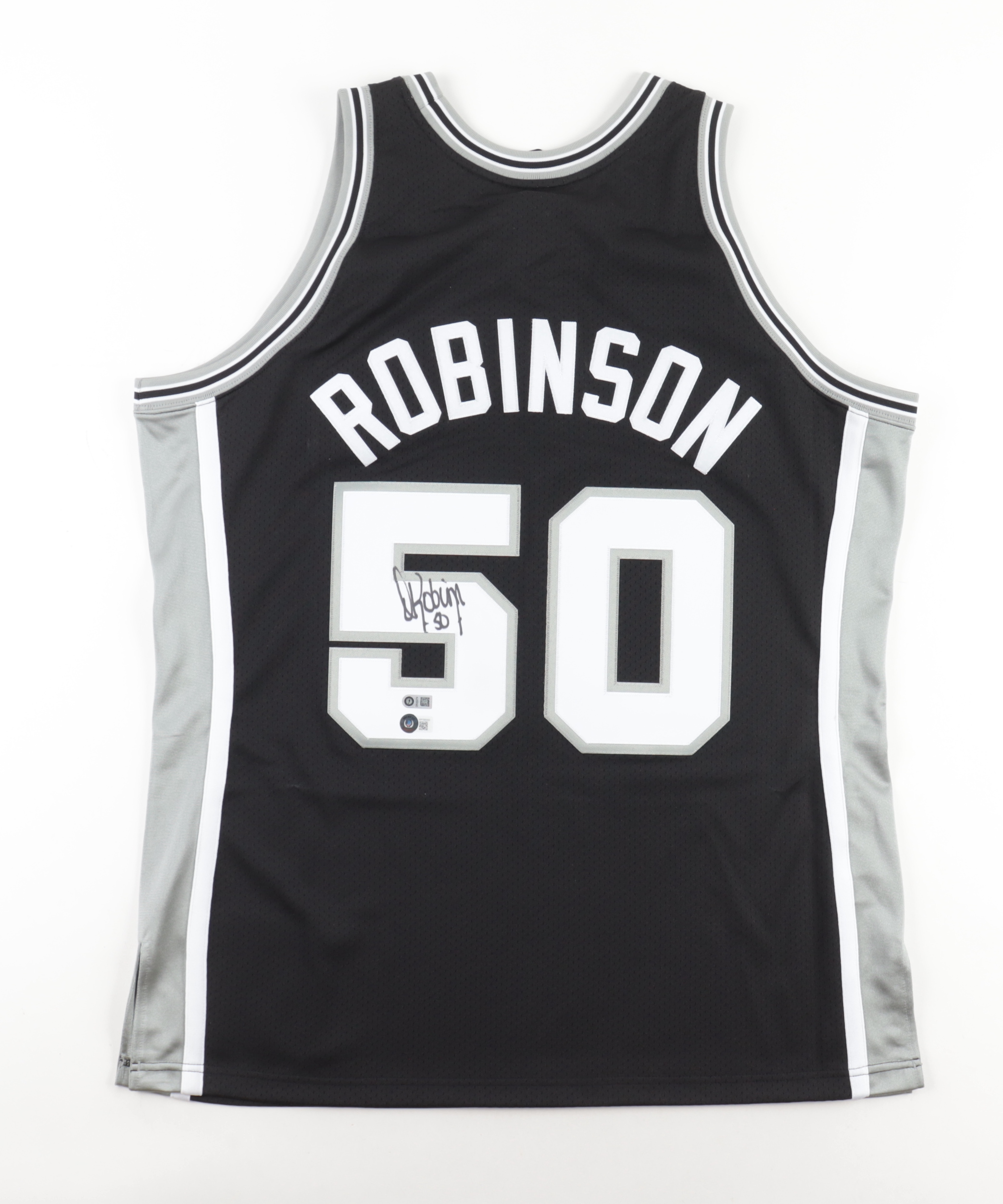 Mitchell & Ness on-court style jersey. Everything is sewn on, size XL. Has been hand-signed by David Robinson (San Antonio Spurs, HOF).