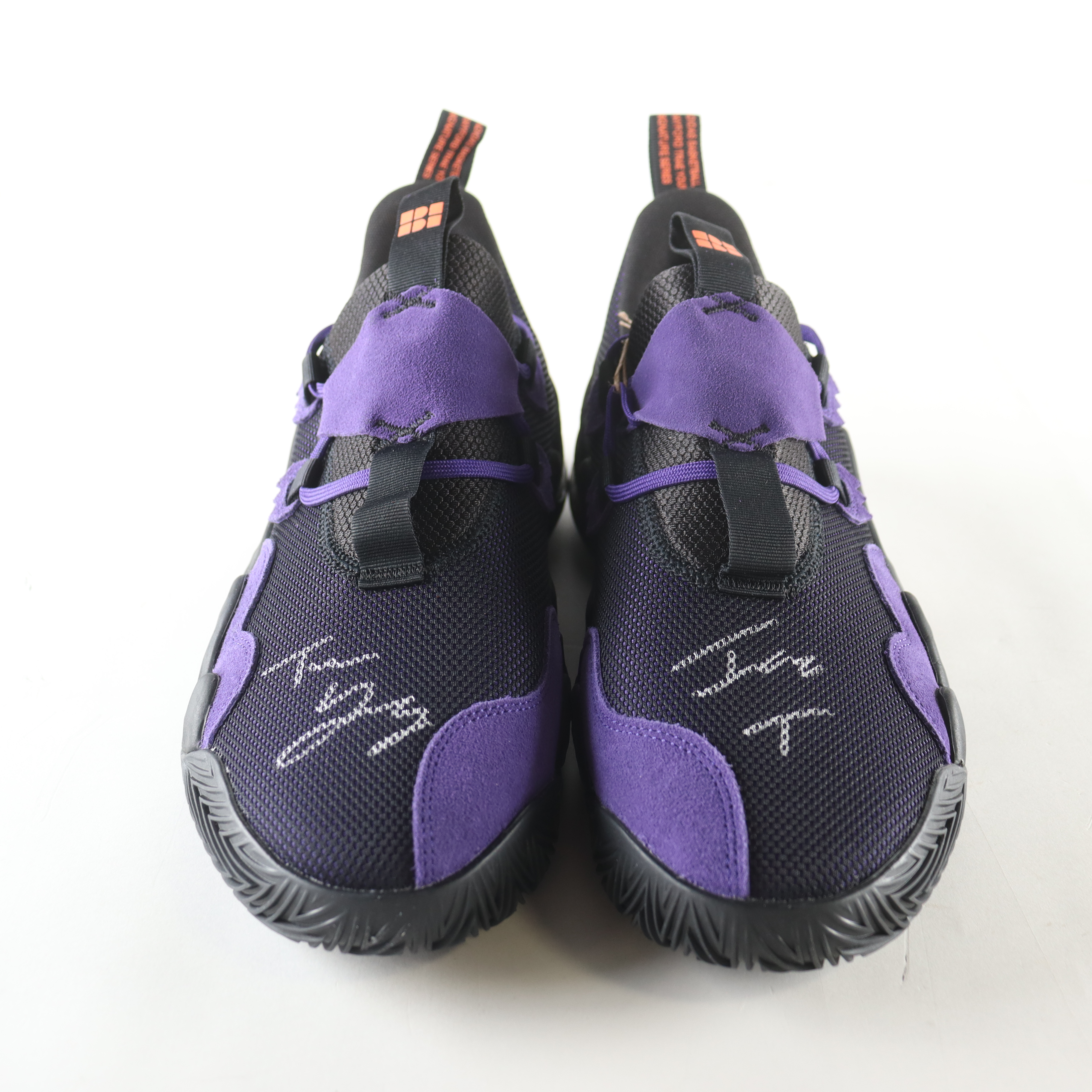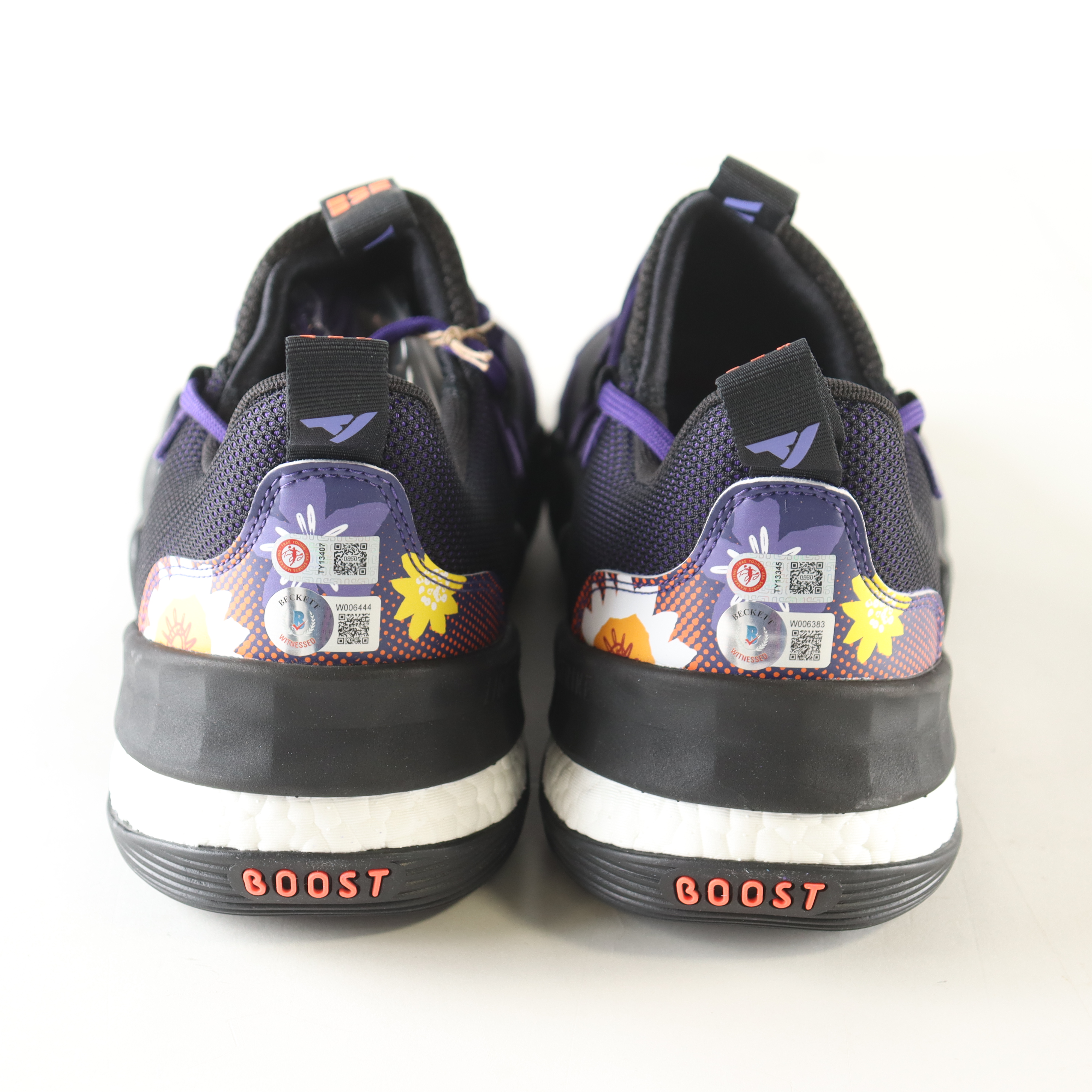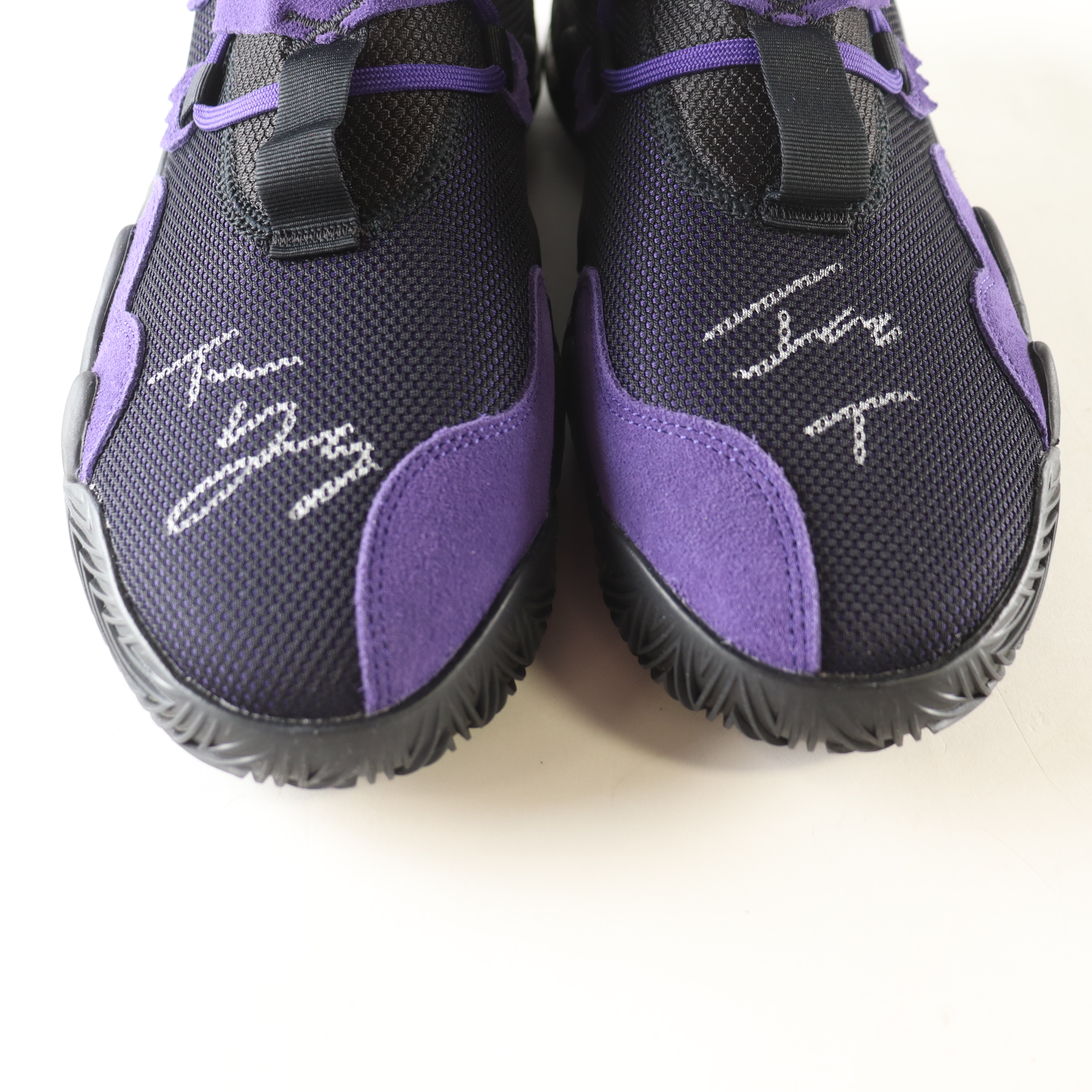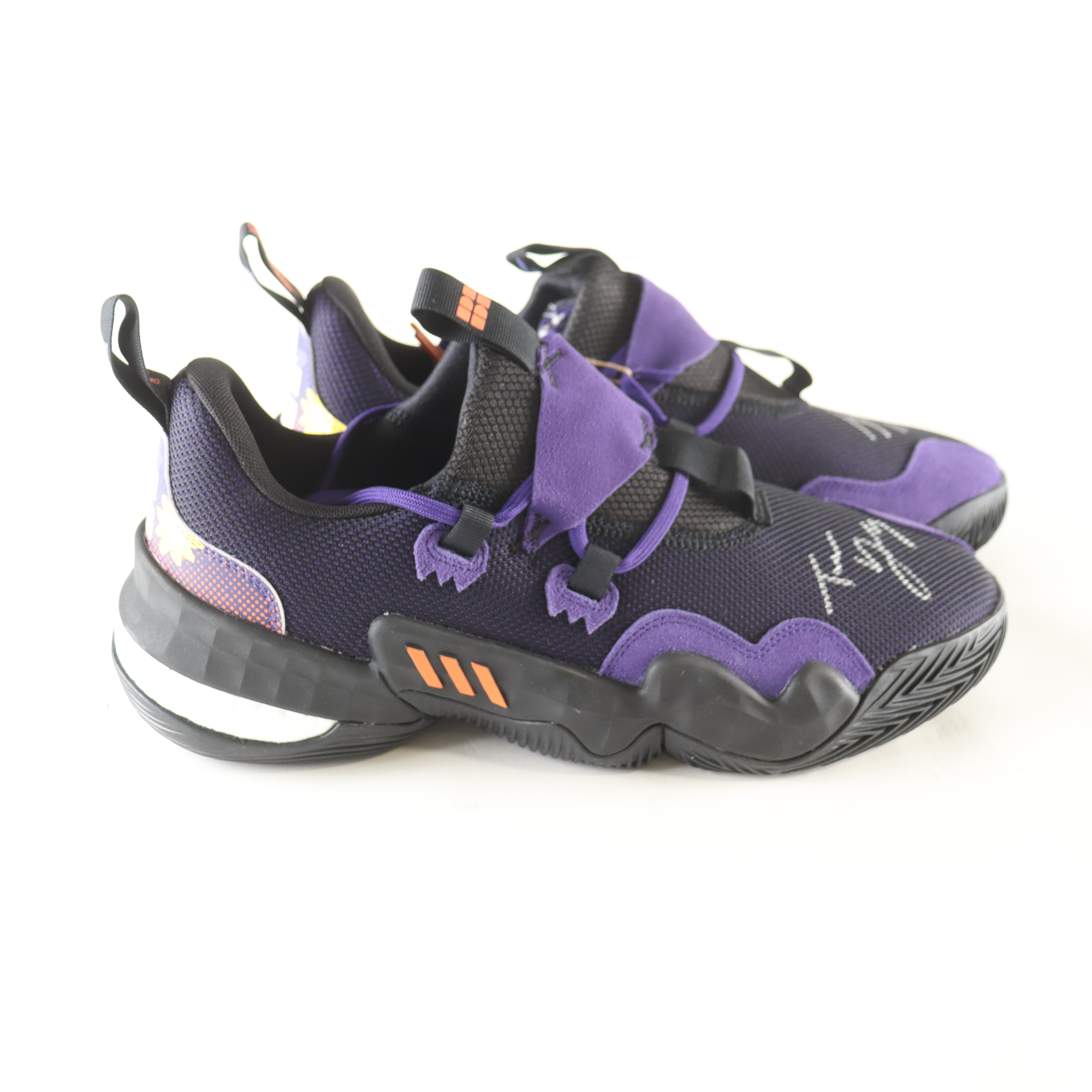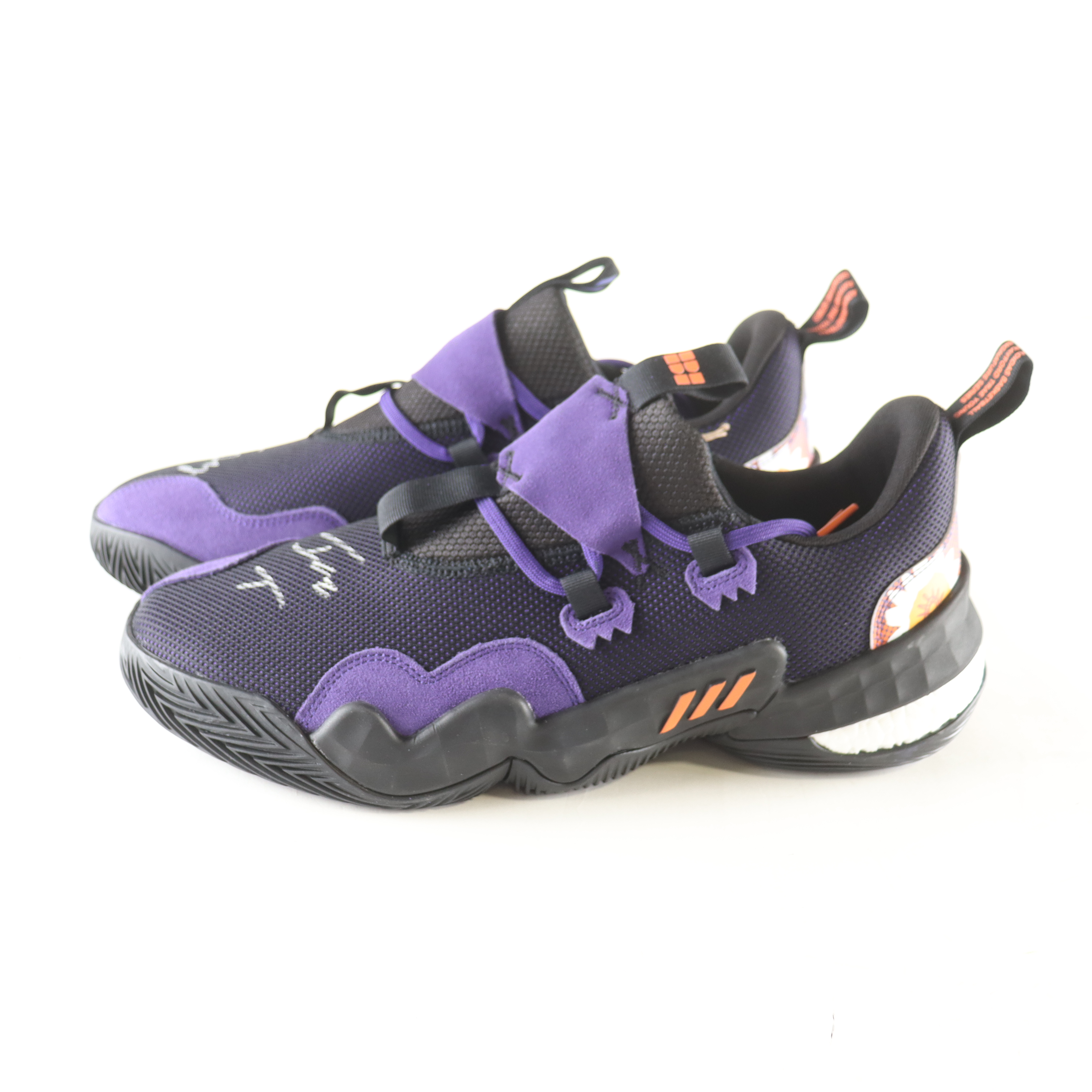 Adidas basketball shoes size 12.5. Both shoes have been hand-signed and inscribed by Trae Young (Atlanta Hawks).