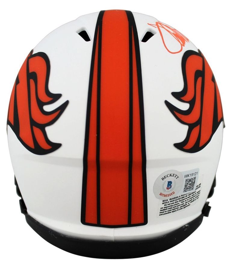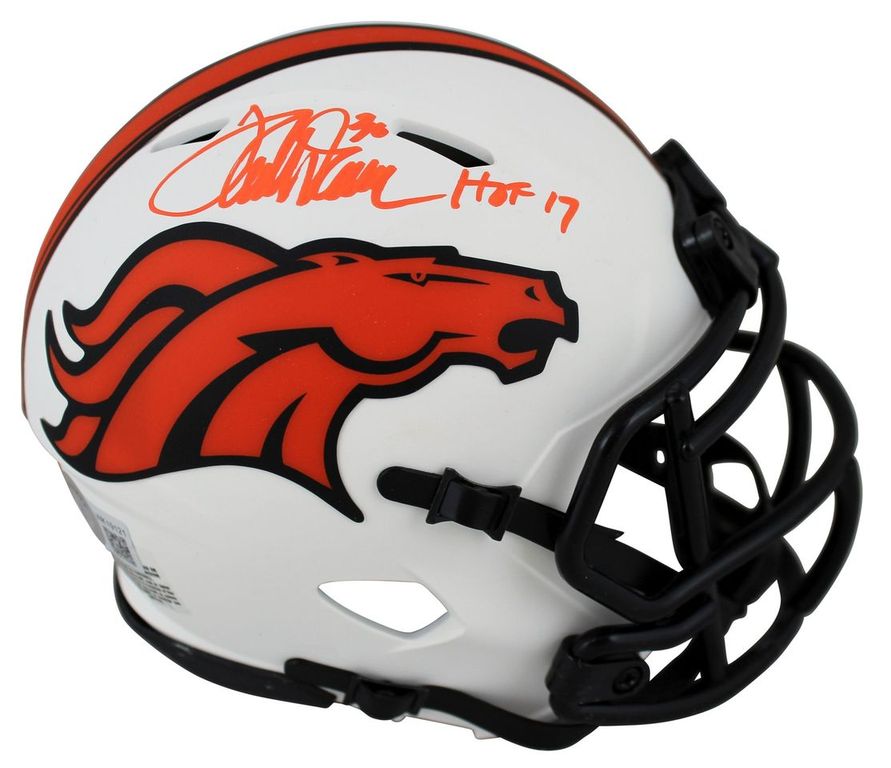 Riddell Denver Broncos lunar eclipse alternate speed mini helmet. Has been hand-signed and inscribed by Terrell Davis (HOF).
