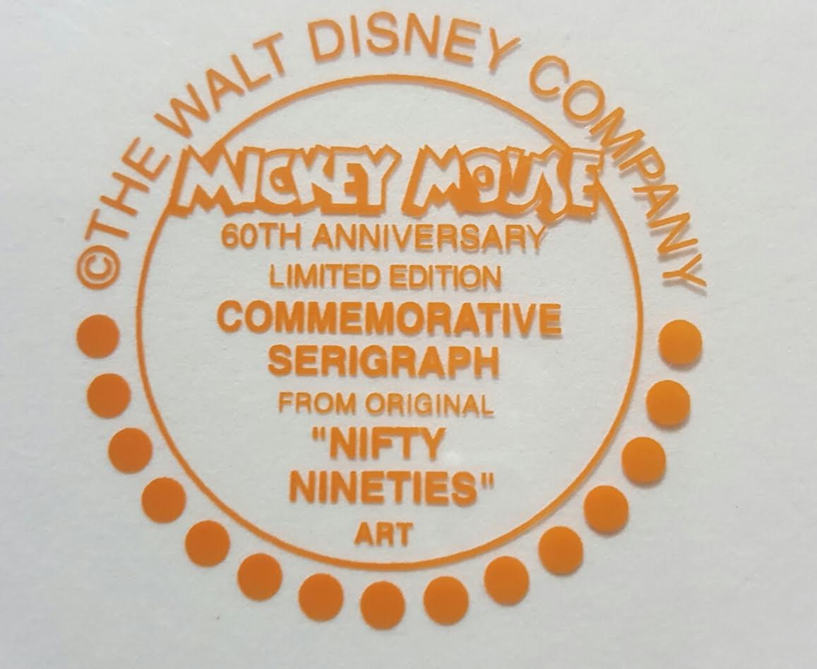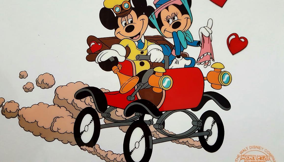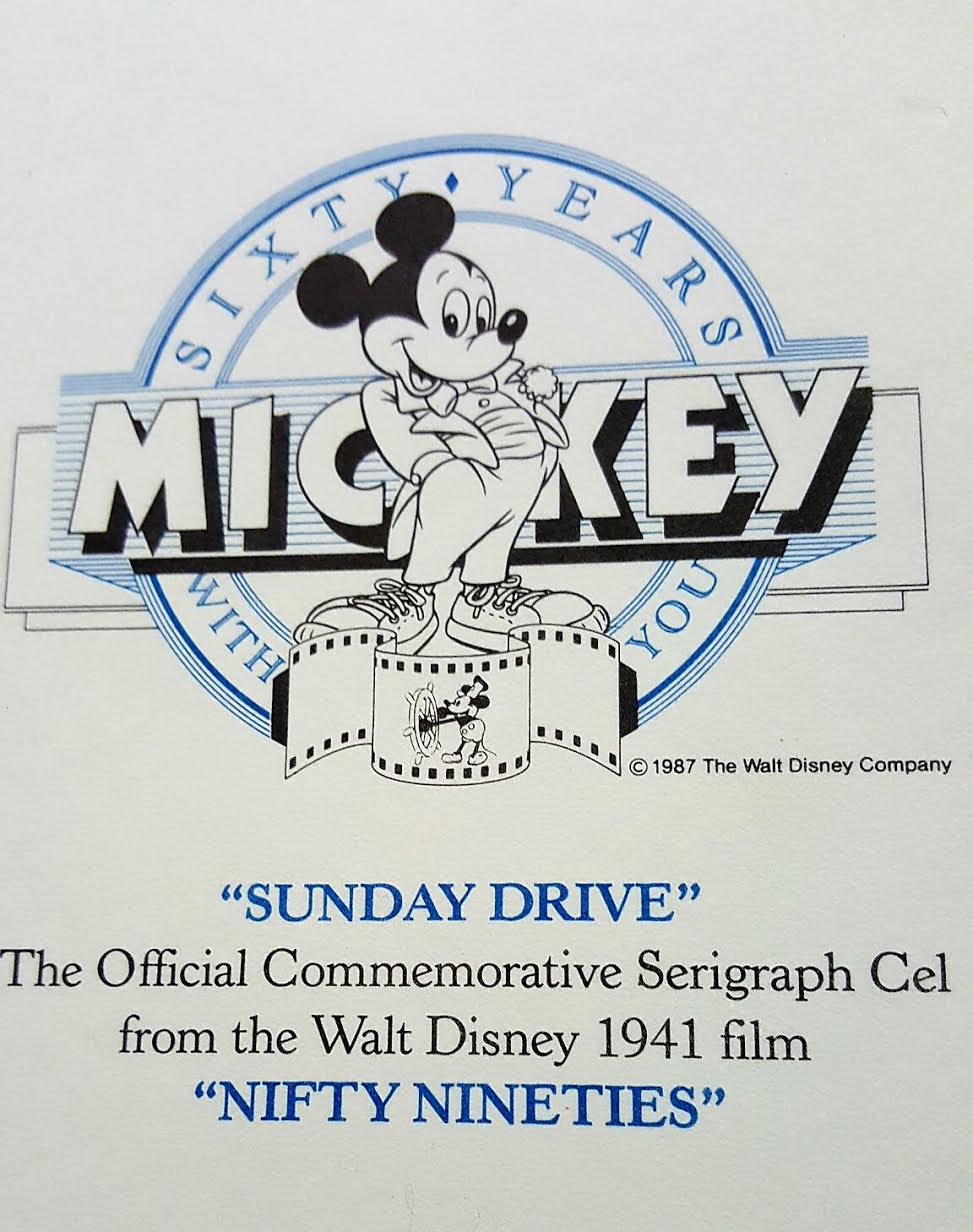 Published by Cirle Fine Art in 1980 for an exclusive American Express offer. Created from the original art and drawings of the 1930's cartoon Nifty Nineties. Mickey and Minnie are out for a Sunday Drive. This is a Limited edition serigraph cel.