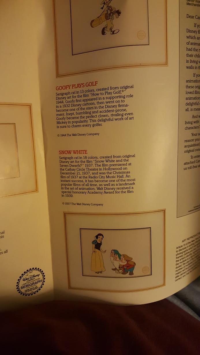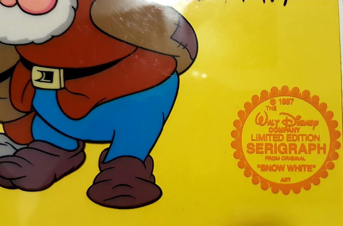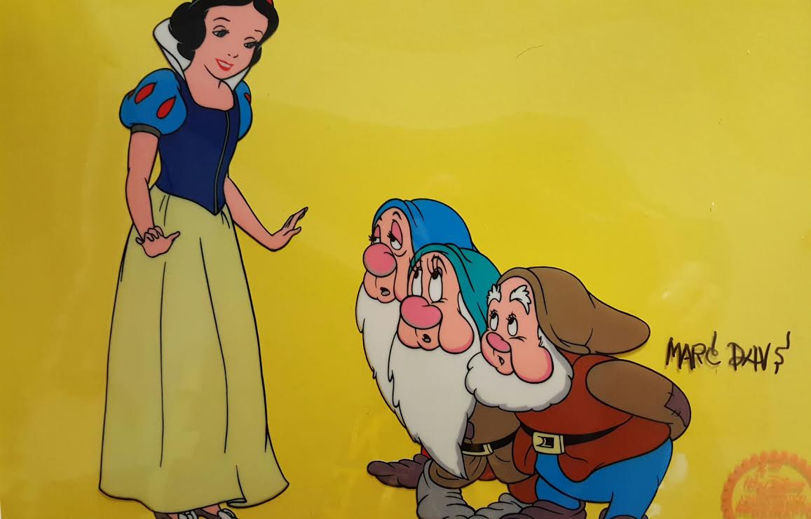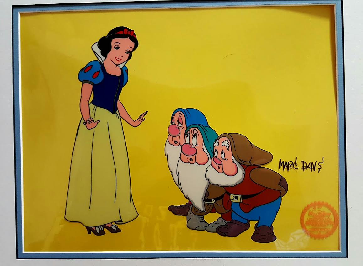 Marc Davis signed Display measures 16" x 19" in size. Snow White with 3 of the 7 dwarfs Sleepy, Bashful and Happy. Includes an authentication seal from Walt Disney in the lower right corner. This is a limited edition piece. This a clear cel photographed on a golden background.