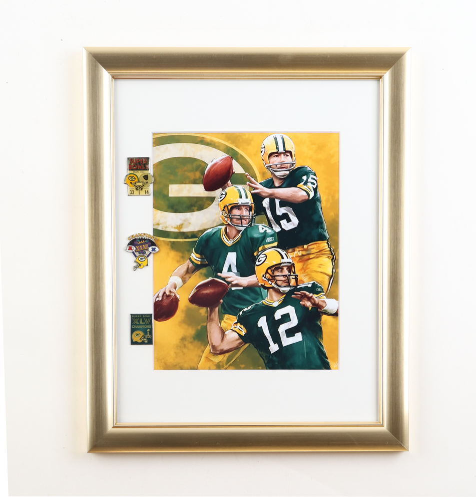 Custom frame measures 13" x 16" in size and features a photo of Bart Starr (D. 2019, Green Bay Packers, HOF), Brett Favre (Green Bay Packers, HOF) and Aaron Rodgers (Green Bay Packers). Display includes (3) Super Bowl pins.