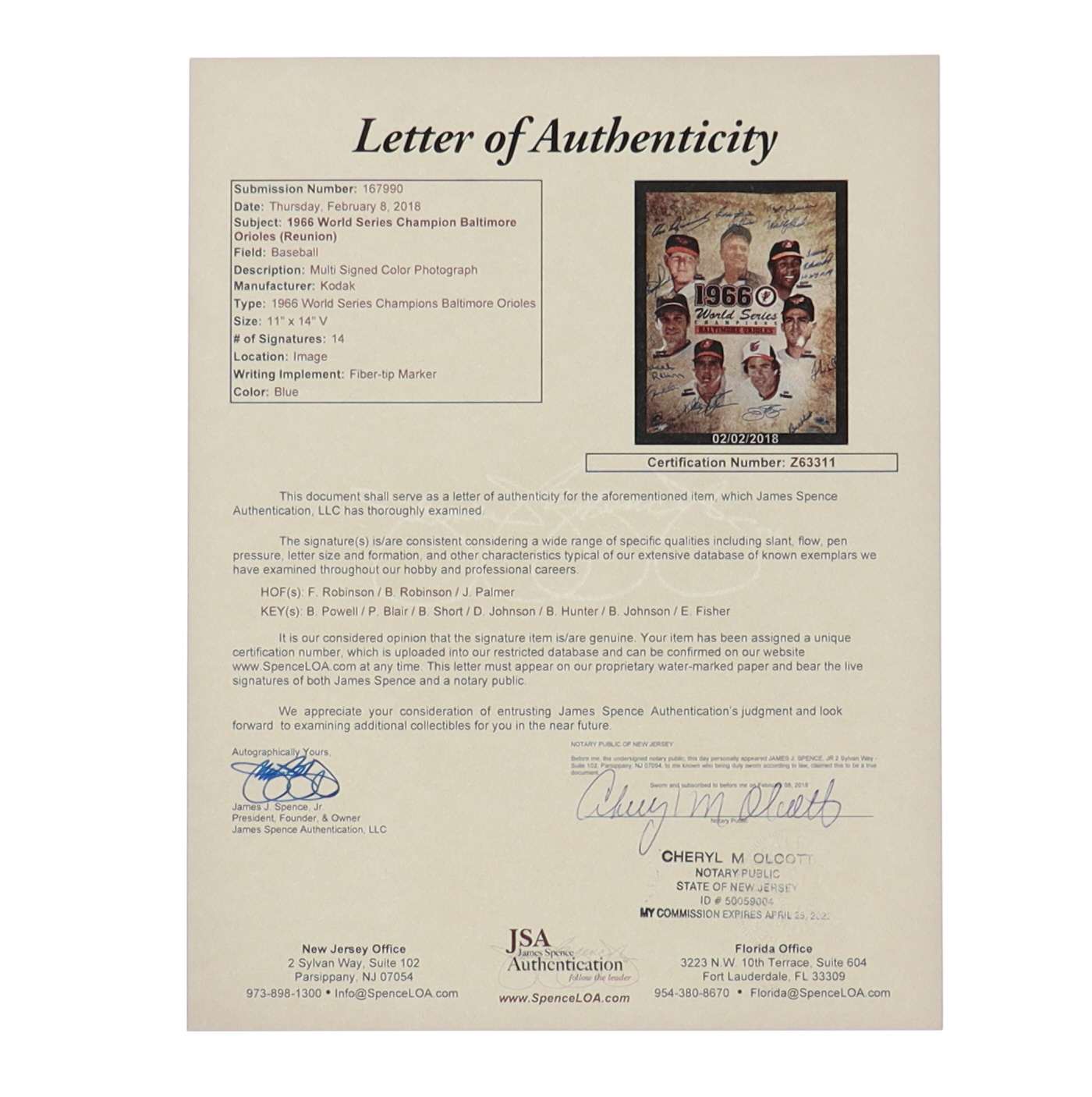 Photo measures 11" x 14" in size. Hand-signed and inscribed by (14) with Frank Robinson, Brooks Robinson, Jim Palmer, Boog Powell, Paul Blair, Bill Short, Davey Johnson, Billy Hunter, Bob Johnson, Eddie Fisher and (4) others.