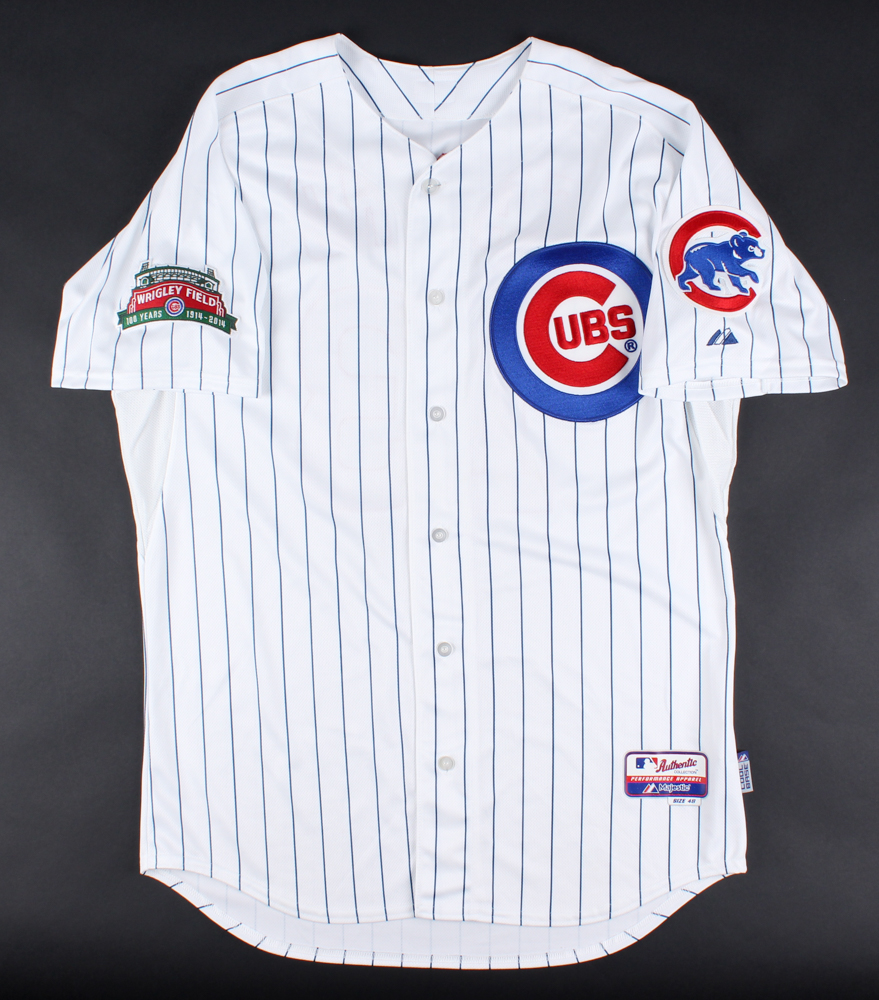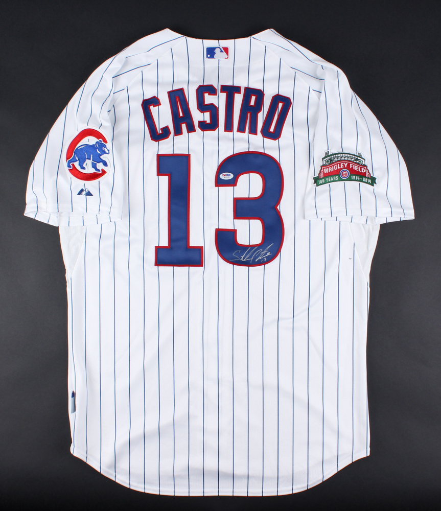 Majestic on-field style jersey. Everything sewn on, size 48. Hand-signed in silver paint pen by Starlin Castro (Cubs).