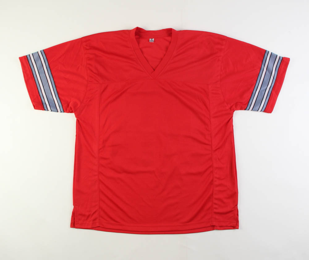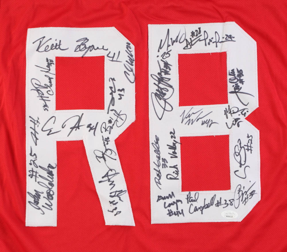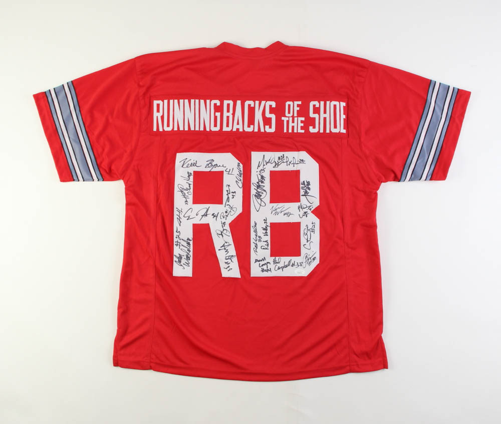 Custom on-field style jersey. Everything sewn on, size XL. Hand-signed by (23) Running Backs of The Shoe including Tim Spencer, Jeff Logan, Derek Combs, Pete Johnson, Michael Wiley, Chris Beanie Wells, Ric Volley, Champ Henson, Jim Otis, Paul Campbell, Vince Workman, John Woolridge, Keith Byars, George Cooper, Mike Weber Jr., Antonio Pittman, Carlos Snow, Carlos Hyde, Vaughn Broadnax, Pepe Pearson, Butler B'ynote', Jordan Hall, Rick Galbos.
