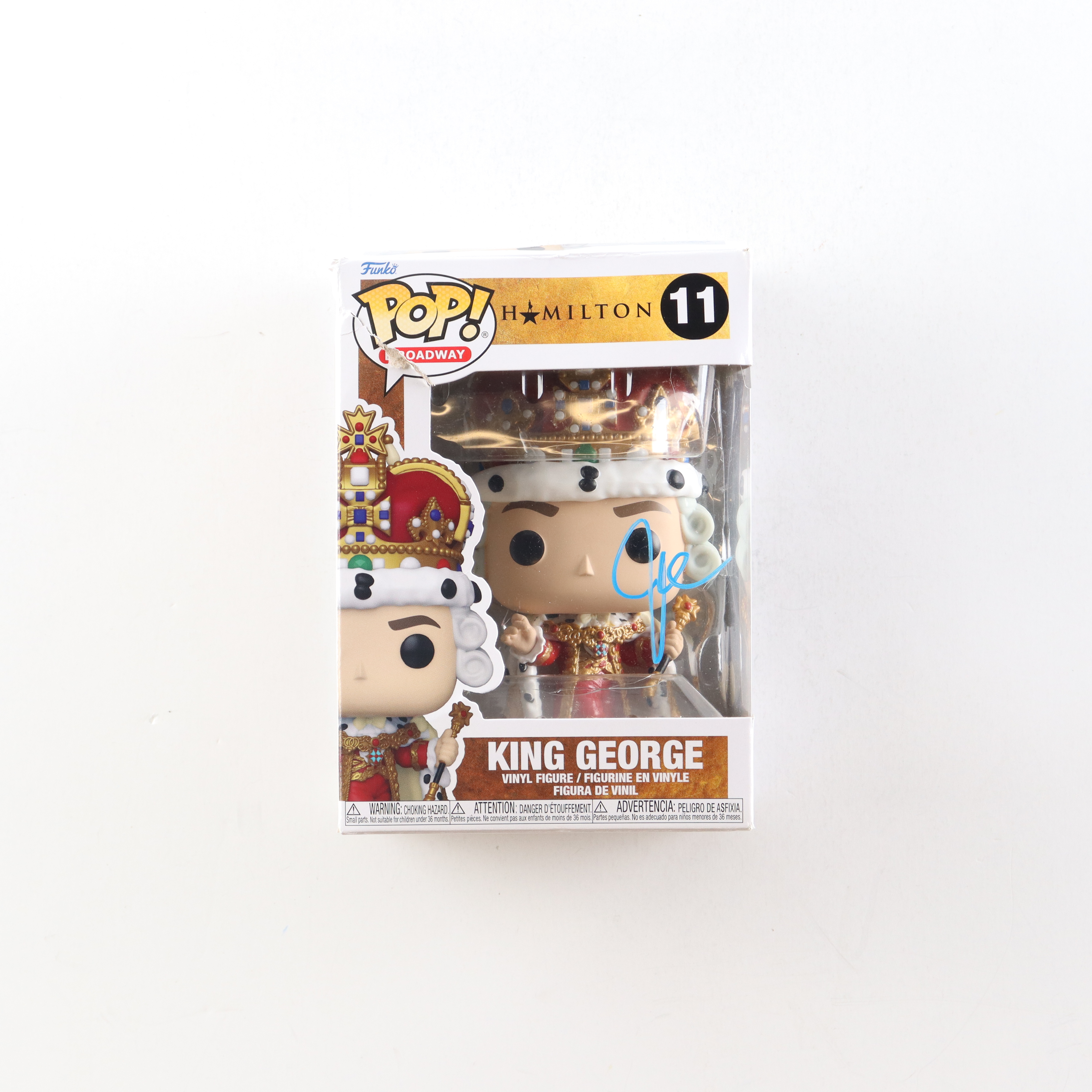 Vinyl figure measures approximately 4" tall and has been hand-signed on the packaging by Jonathan Groff (King George). Please note, there are tears on the top corners of the box and the window is not attached to the packaging.