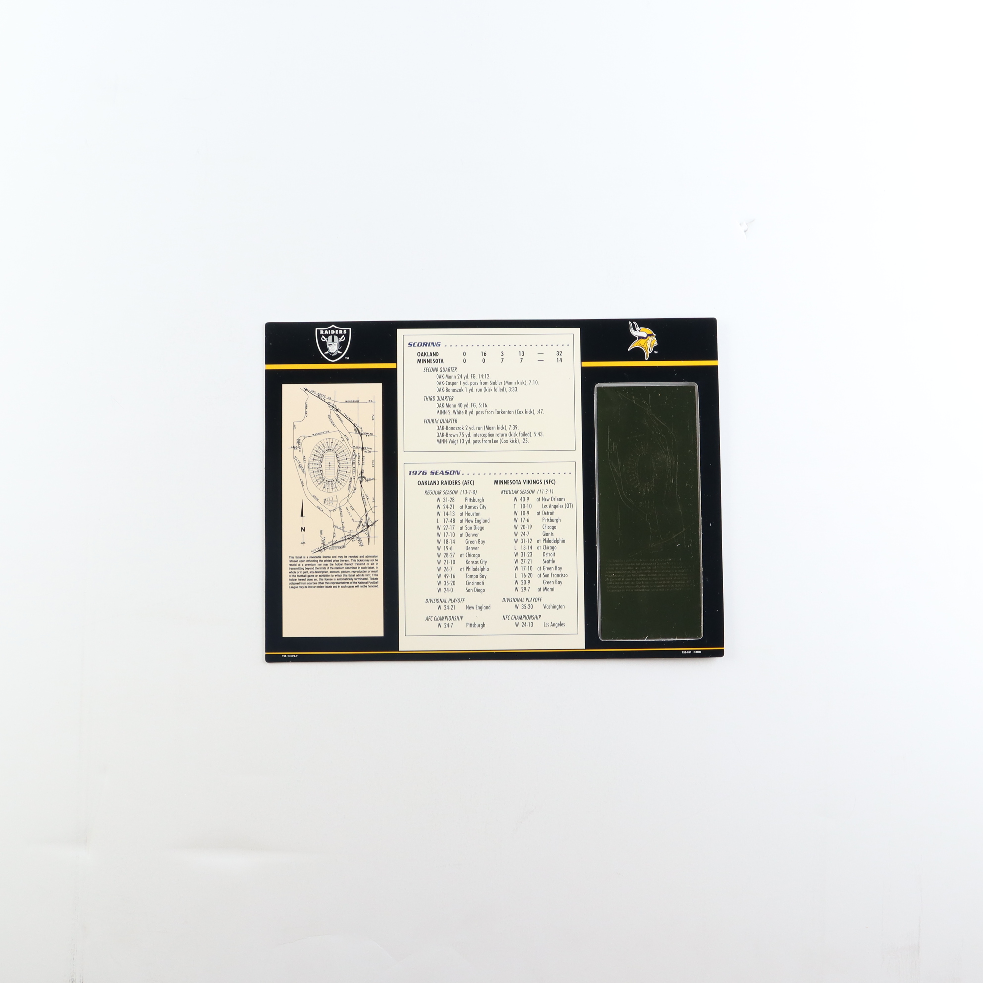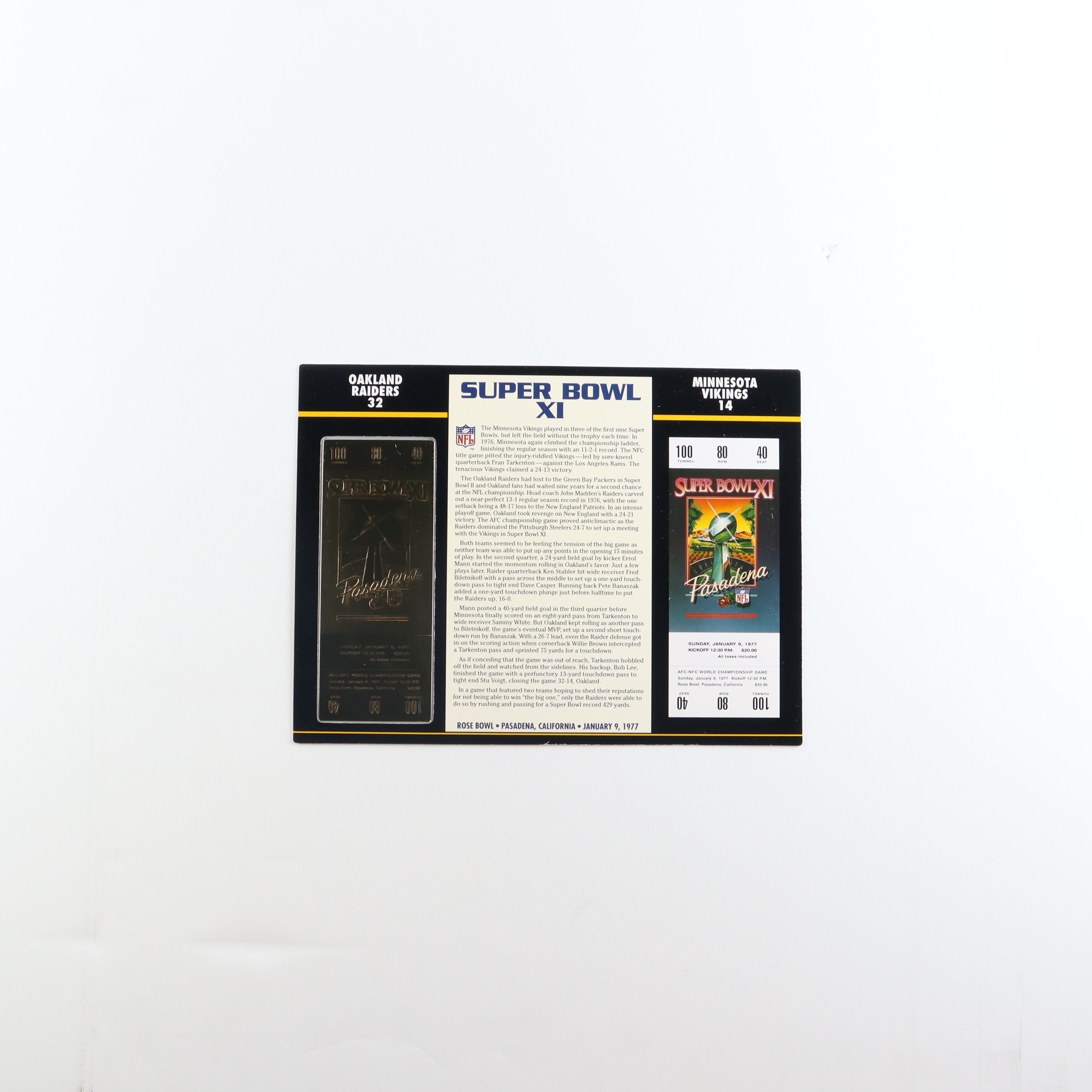 Super Bowl XI Commemorative 9x12 Score Card Display with 23kt Gold Ticket