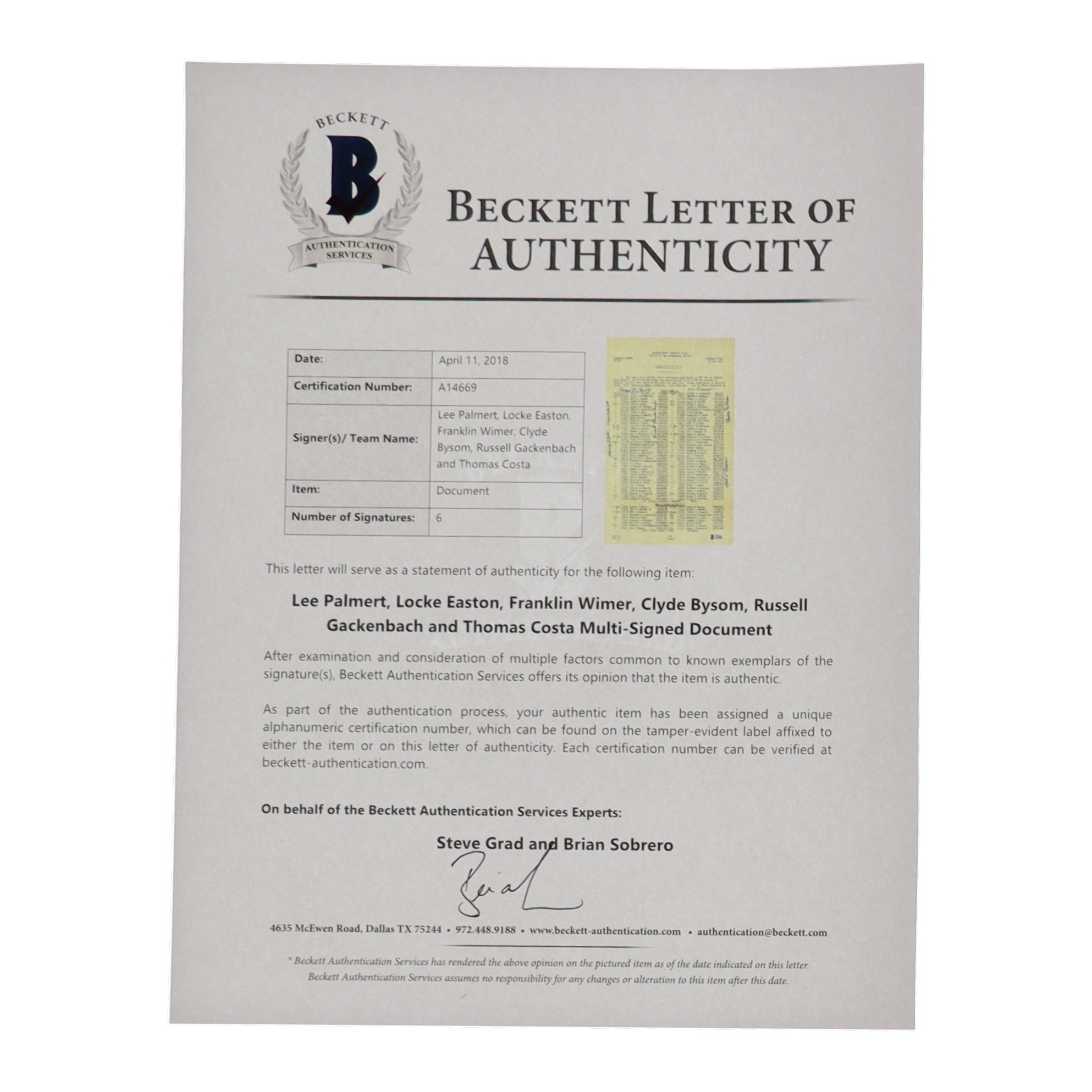 Printed record measures approximately 8.5" x 14" in size and has been hand-signed by (6) including Lee Palmert, Locke Easton, Franklin Wimer, Clyde Bysom, Russell Gackenbach and Thomas Costa.