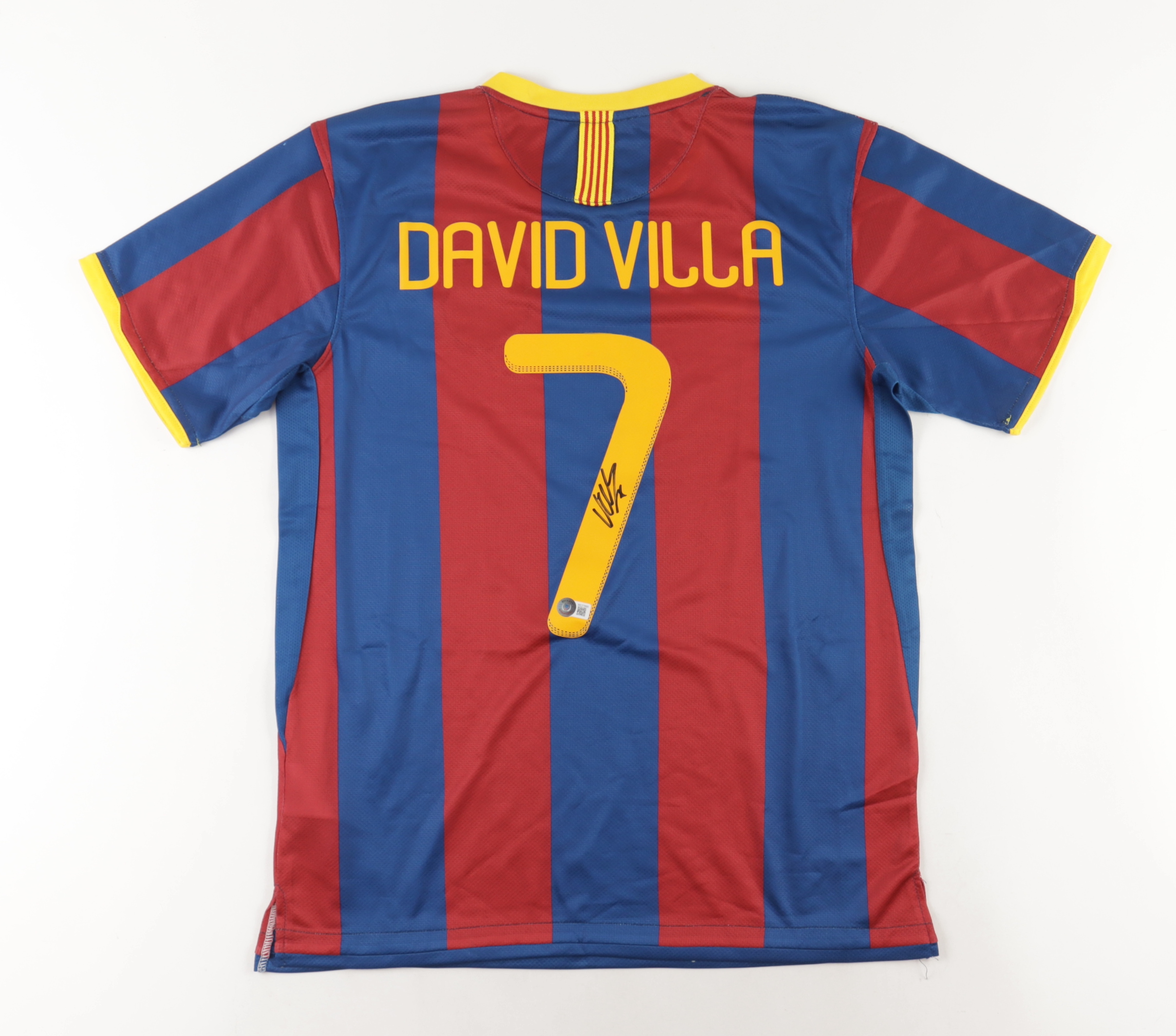 Nike on-field style jersey. Everything is printed on, size M. Hand-signed by David Villa (Barcelona F.C.).