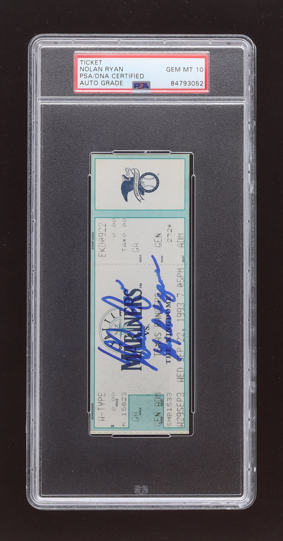 Nolan Ryan Signed 1993 Rangers vs Mariners Ticket Stub Inscribed "My Last Game" (PSA | Autograph Graded 10)
