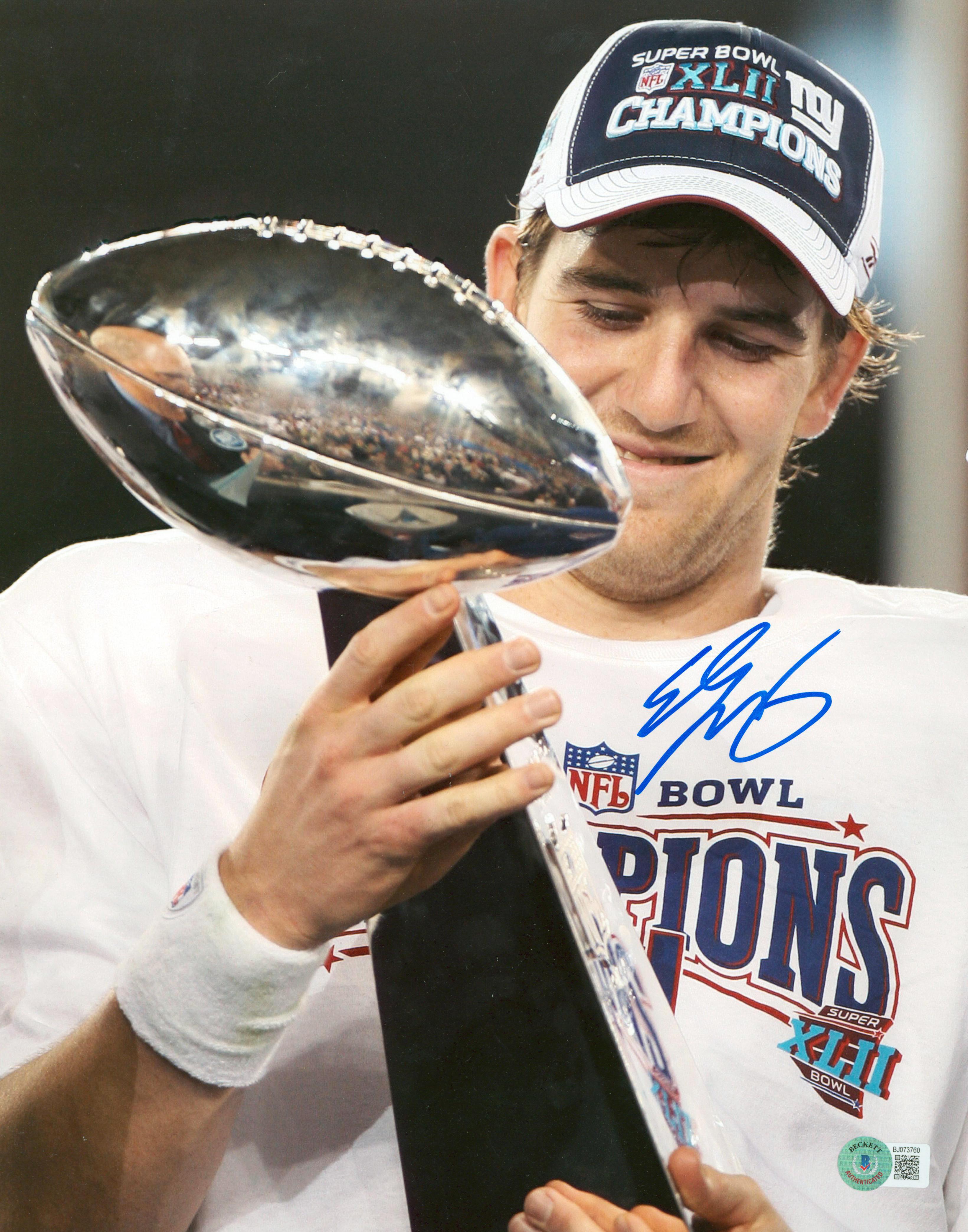 Photo measures approximately 11" x 14" in size. Hand-signed by Eli Manning (New York Giants).