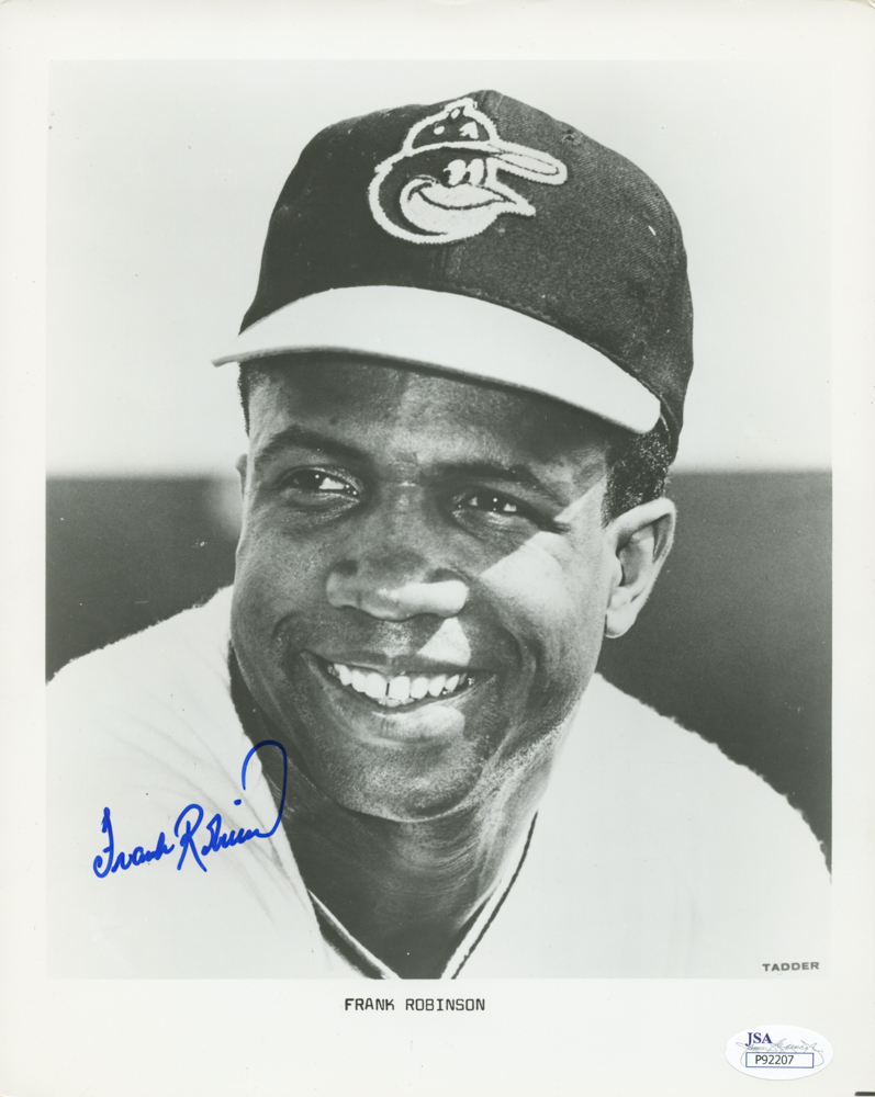 Photo measures 8" x 10" in size and has been hand-signed in blue felt-tip pen by Frank Robinson (Orioles, Reds HOF).