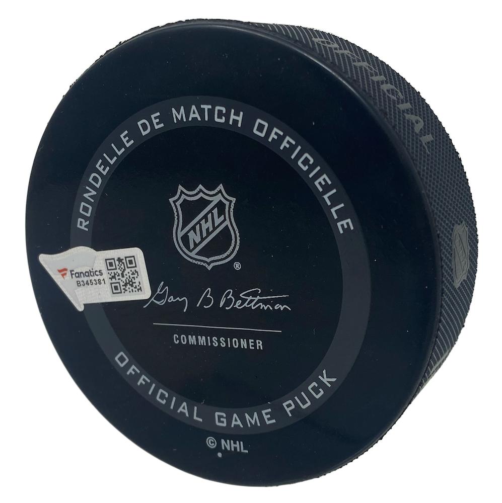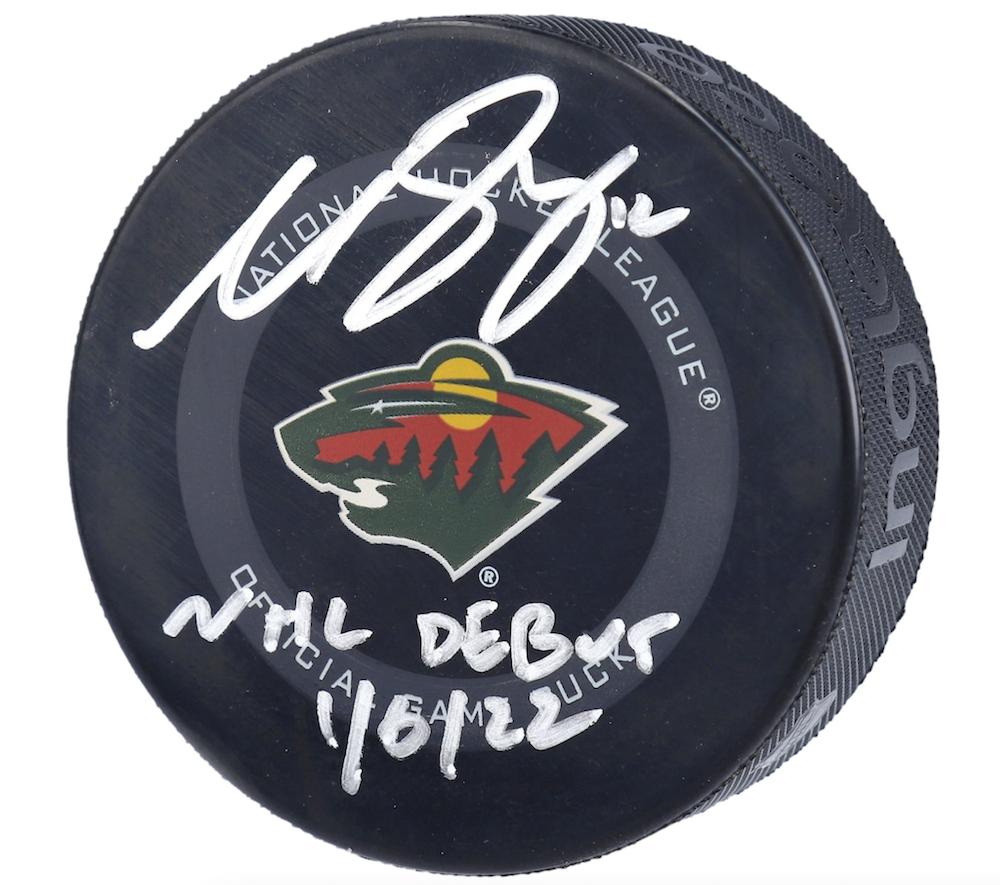Matthew Boldy Signed Wild Official Game Puck and Inscribed "NHL Debut 1/6/22" (Fanatics)