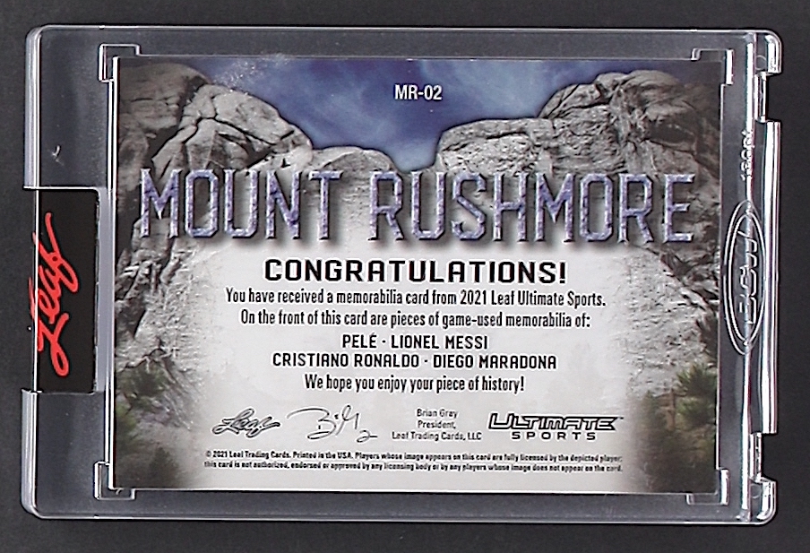 Pele / Lionel Messi / Cristiano Ronaldo / Diego Maradona 2021 Leaf Ultimate Sport Mount Rushmore Quad Memorabilia #MR02 #30 / 30