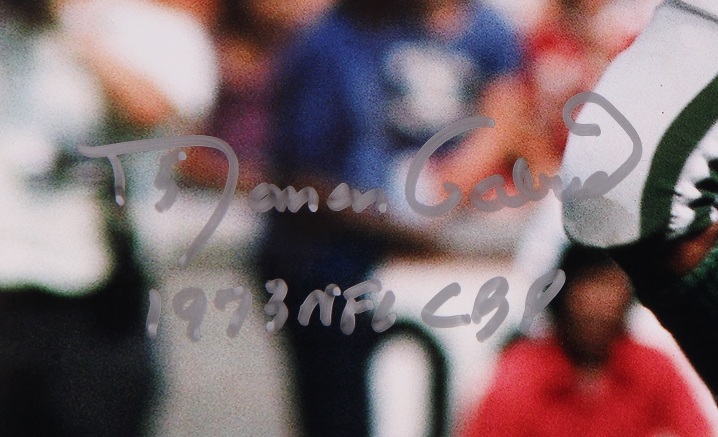 Photo measures 11" x 14" in size and has been hand-signed and inscribed in silver paint pen by Roman Gabriel (Rams).
