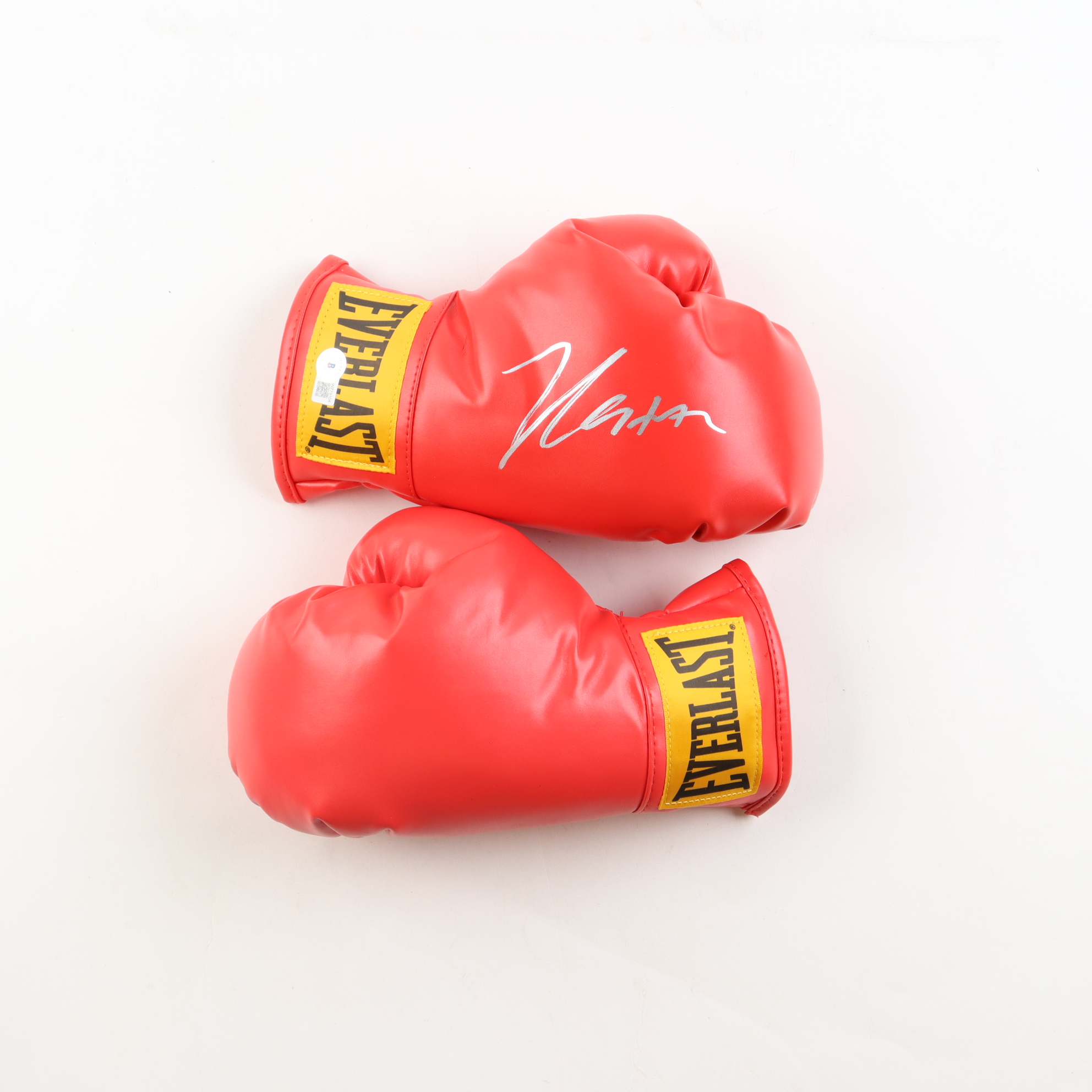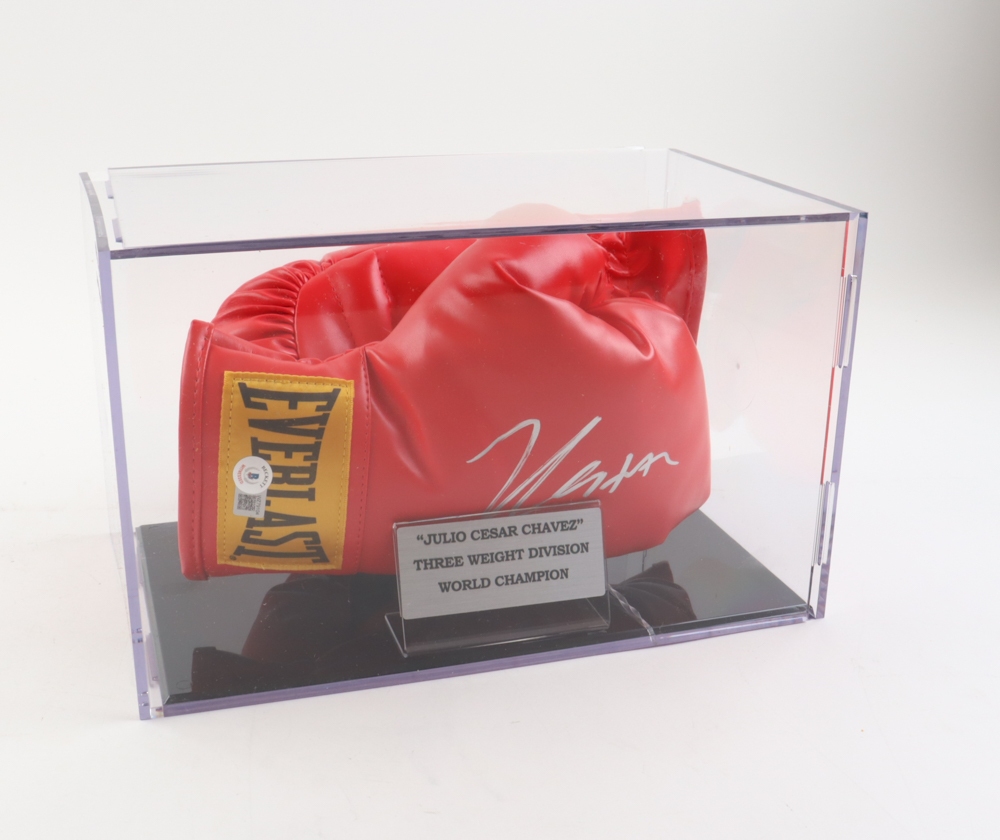 Pair of Everlast boxing gloves. Right glove has been hand-signed by Julio Cesar Chavez (HOF). Display case is included as shown.