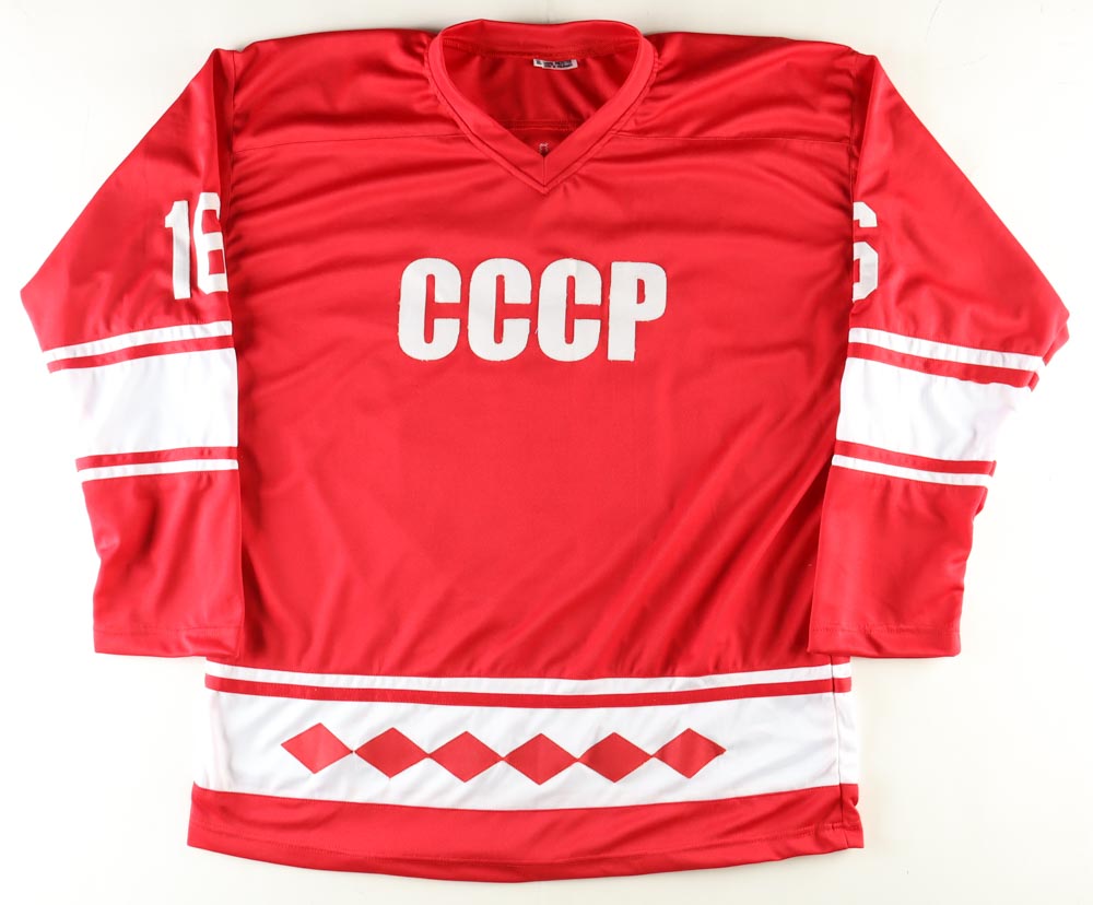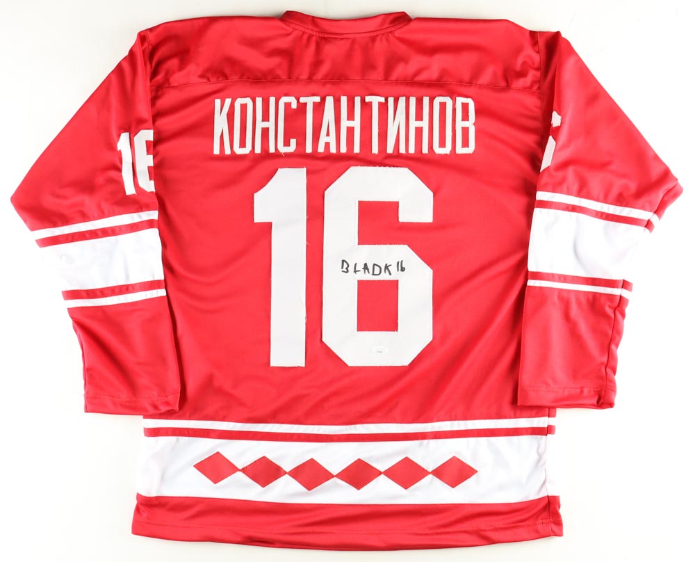 Custom on-ice style jersey. Everything is sewn on, size XL. Has been hand-signed by Vladimir Konstantinov.