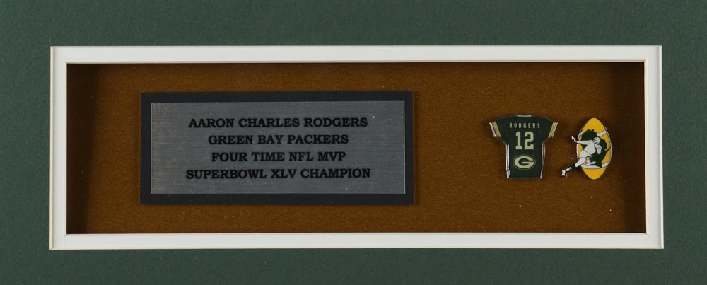Custom frame measures approximately 32" x 36" in size and features an Aaron Rodgers jersey, as well as a set of (2) Rodgers pins.